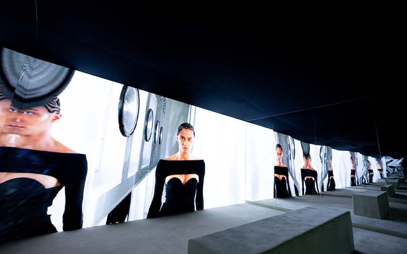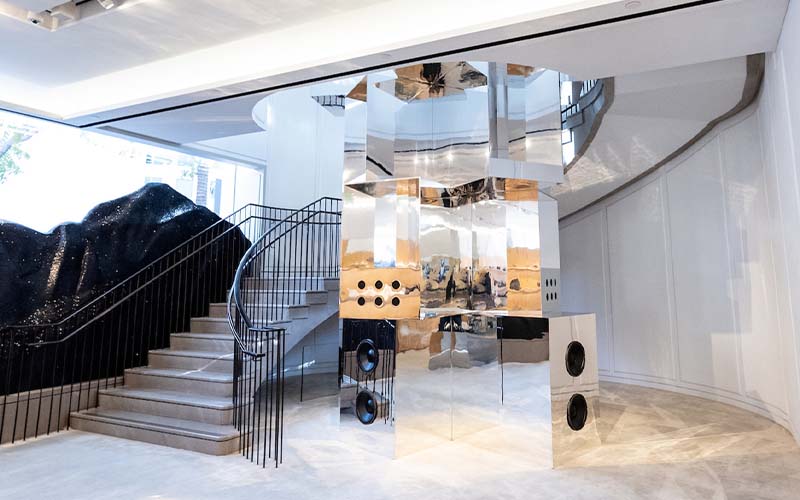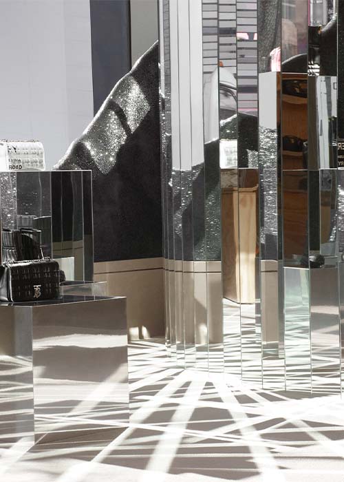 En la tienda insignia, en Rodeo Drive en Beverly Hills, se encuentra la última innovación de Burberry: una experiencia inmersiva que consiste en un viaje a través de espacios únicos e inimaginables. En referencia al nuevo patrón usado en la colección primavera verano 2022, la fachada del local está pintada con un patrón caleidoscópico rosa, blanco y negro. Mientras que al interior brillan los pilares espejados con una topografía escultórica. En el piso de arriba se encuentra una íntima sala en la que, con un audio envolvente, se transmite la película de presentación. Los sonidos varían entre la música, la naturaleza y el viento, demostrando la mirada salvaje de Tisci para su última entrega.