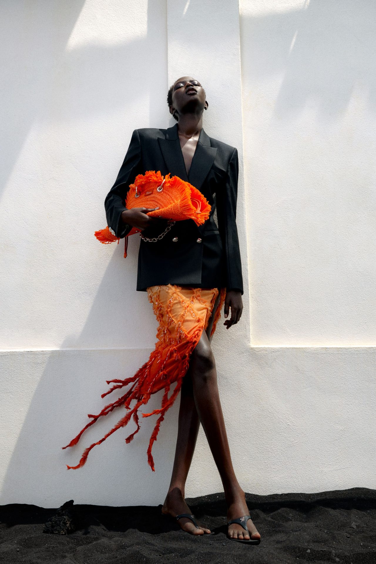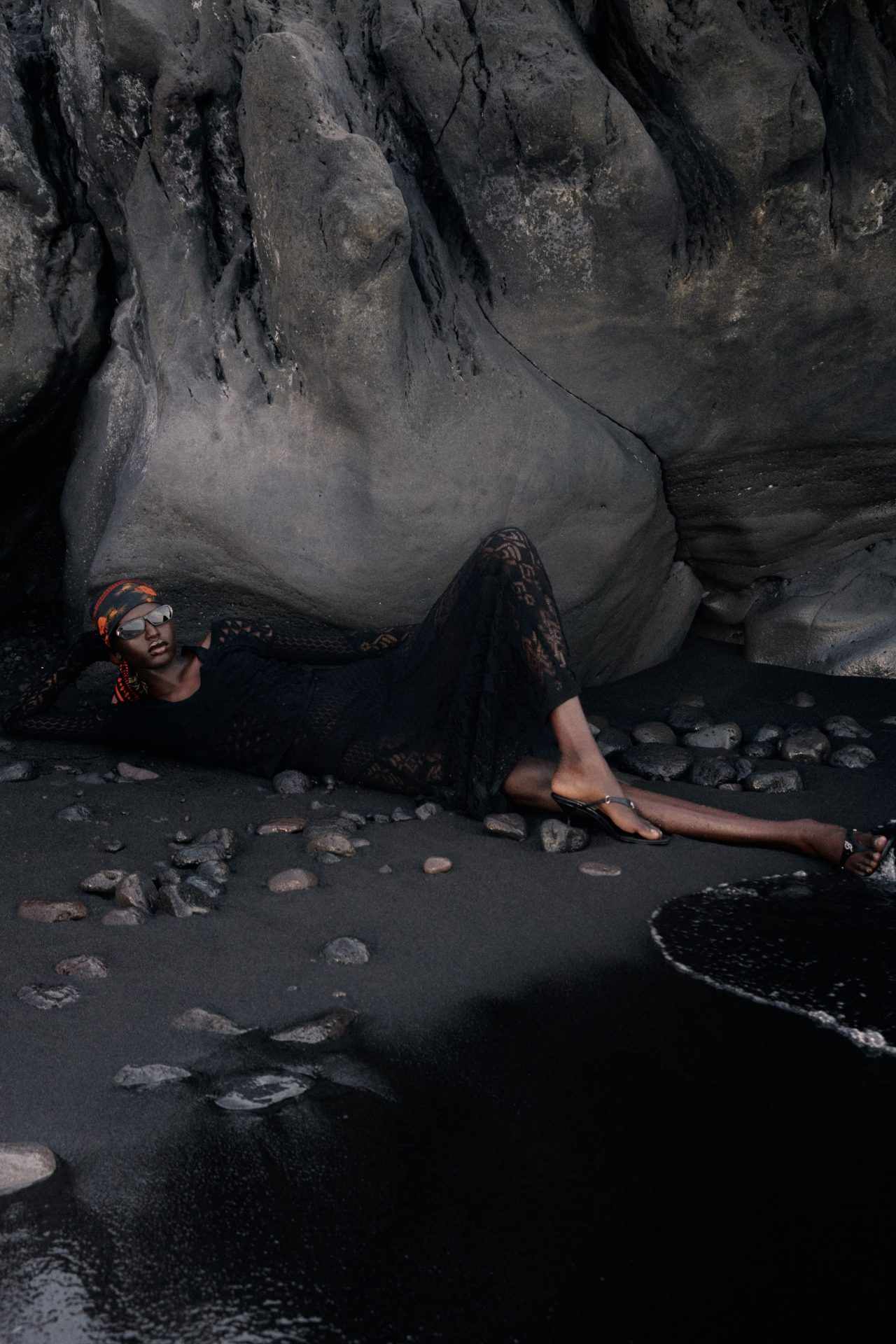 Stromboli, el enclave elegido para fotografiar la colección, no es solo un paisaje; es parte del manifiesto. El negro profundo de sus arenas, el dramatismo de sus rocas y la tensión de su geografía dialogan con una colección que apuesta por lo inesperado: blazers confeccionados en toalla blanca, listos para desnudarse en un giro de muñeca; minivestidos de gasa arrugada con estampado de cebra, que grafica el pulso salvaje bajo la superficie.