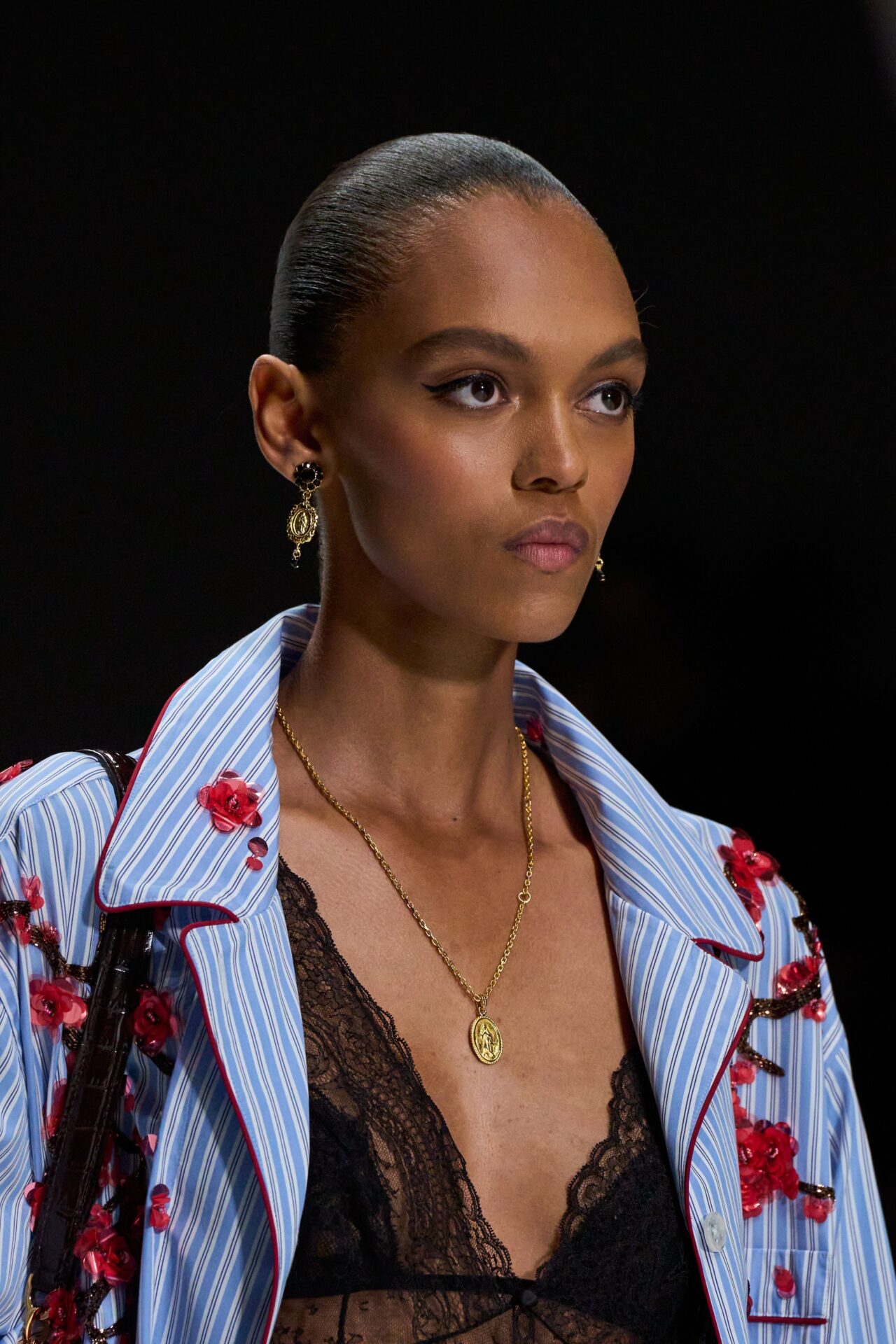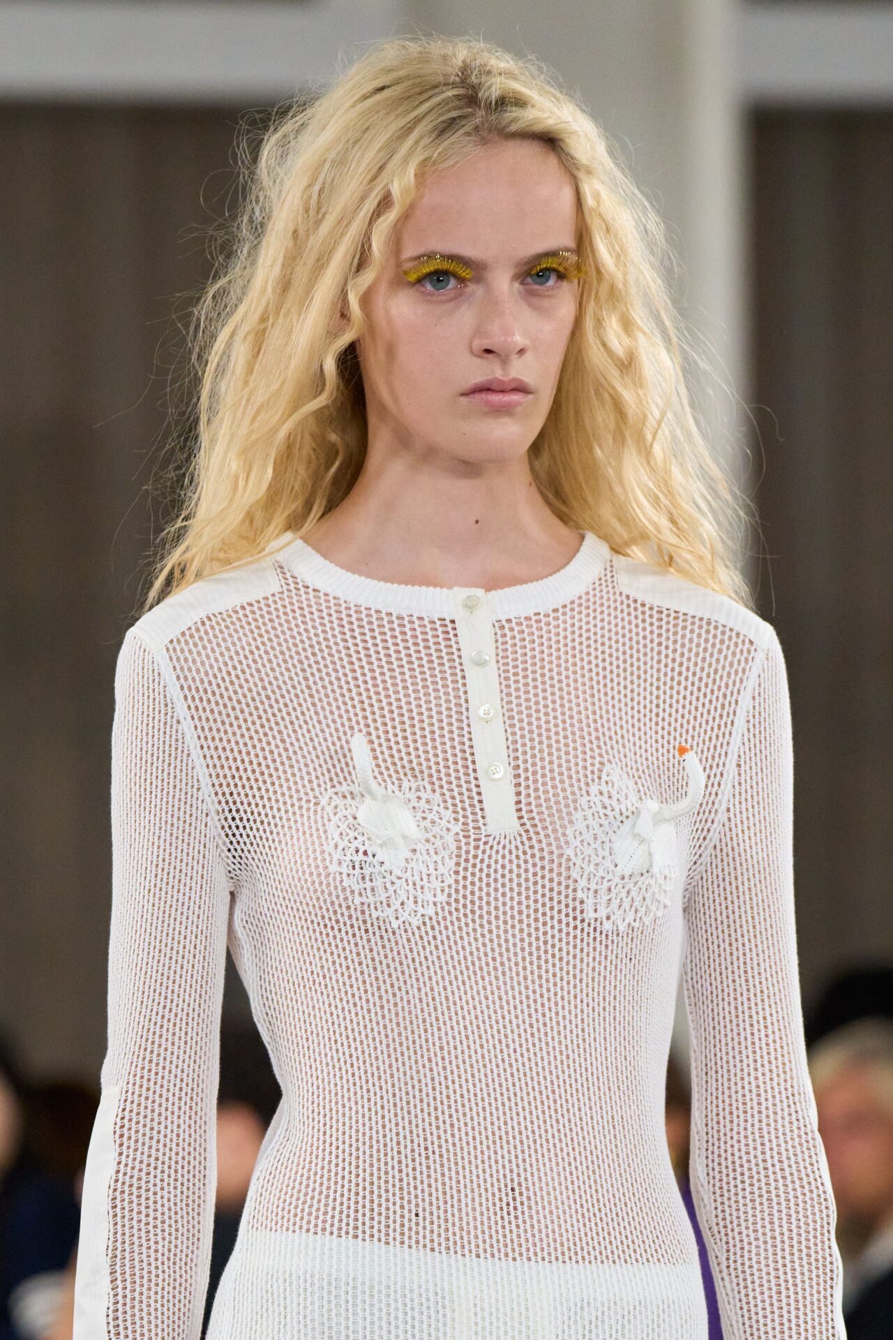 Más allá de las tendencias principales, también hubo espacio para la experimentación: labios en tonos baya en Versace y Sportmax, pestañas doradas en Moschino, delineados gráficos en KNWLS y lágrimas de perlas en Giuseppe Di Morabito. Pequeños guiños creativos que, seguramente, empezaremos a ver tanto en editoriales como en el street style alrededor del mundo.