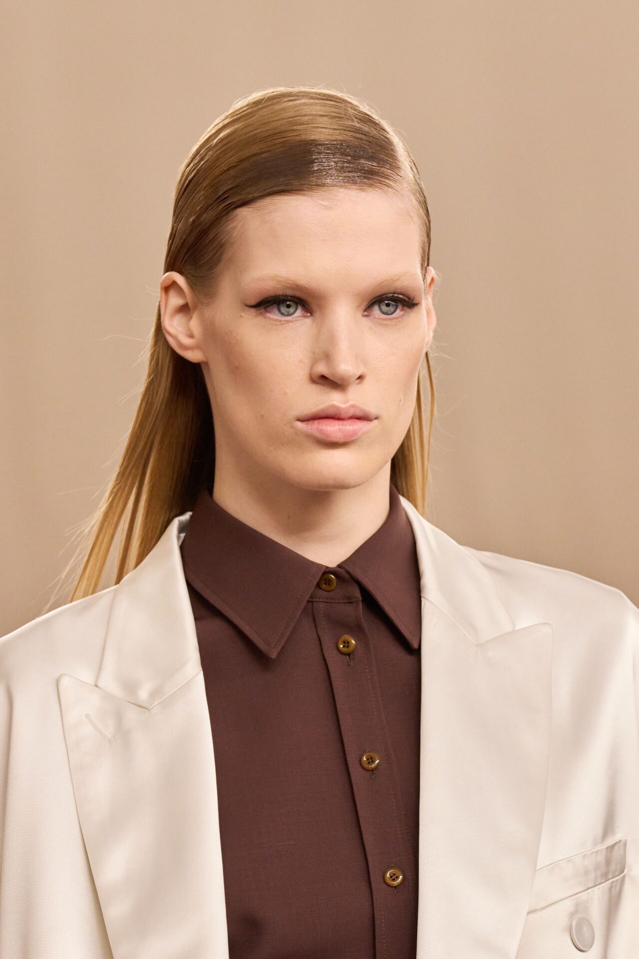 En Prada, el estilista Guido Palau presentó un cabello ultra liso y engominado, aunque con un toque desgastado que rompía con la perfección. Tod’s reforzó esta misma idea con mechones de efecto mojado, confirmando que el gel regresa con fuerza, pero ahora con una lectura mucho más contemporánea.