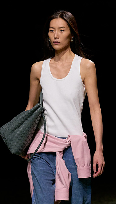 «La idea era reconectar a Italia a lo largo de su historia», mencionó Blazy, cuyo show incluyó la estatua de Boccioni y unos bronces romanos prestados por diversos museos. «El debate que tuvimos con el equipo fue sobre la idea de nacionalismo positivo, que puedes reapropiarte de tu historia de una manera muy positiva». Una idea que se manifestó en una variedad artesanal que responde a la excelencia propia de los cueros italianos. El trabajo artesanal se funde con el diseño y con 81 looks, Bottega revisita sus códigos tradicionales. Los conceptos ‘intreccio’ e ‘intrecciato’ aparecieron en botas hasta el muslo y también los bolsos Sardine y Kalimero. Por supuesto, lo más llamativo fue el uso del cuerpo para piezas que parecían de algodón o denim; prendas que resurgieron de la entrega previa, pero que, sin duda, constituyen un básico transformador. Incluso, el diseñador empleó la piel para crear un efecto en capaz que hasta simulaba el movimiento.