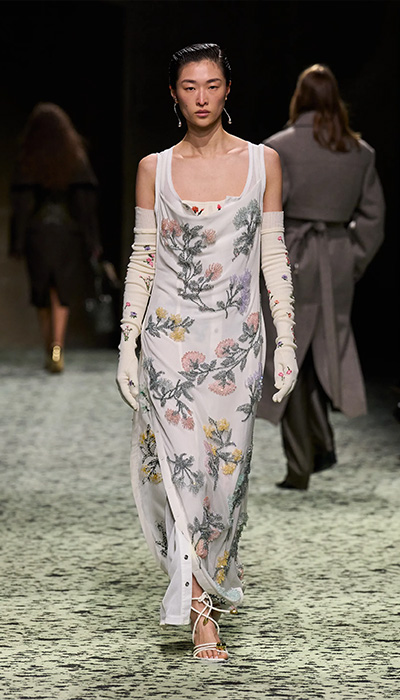 Igualmente hubo vestidos en capas con bordados de flores, que aludían a los de las estrellas de la televisión de los cincuenta y un little black dress con escote en picado. Este, además, tenía una abertura frontal lo suficientemente extensa para revelar las botas trenzadas que lo acompañan. Ahora, lo que realmente destacó fueron los materiales. Desde ese cuero tratado en forman de algodón y denim, hasta una búsqueda de telas ligeras y sin restricciones. Precisamente, fue bajo estas nociones que se trató el cuero que, de acuerdo con Blazy, fue afeitado para hacerlo más ingrávido. Y aquella excepcionalidad también se plasmó en un abrigo largo que contrario a lo imaginado, no estaba bordado, si no, tejido en una sola pieza. La marroquinería fue el centro de todo y la estética, una muestra de la generosidad instintiva del diseñador. «Siempre miro cómo las mujeres y los hombres se superponen. Es muy sofisticado, incluso cuando no funciona. Es muy personal», dijo cerrando la trilogía que marca el inicio de su etapa en Bottega Veneta.