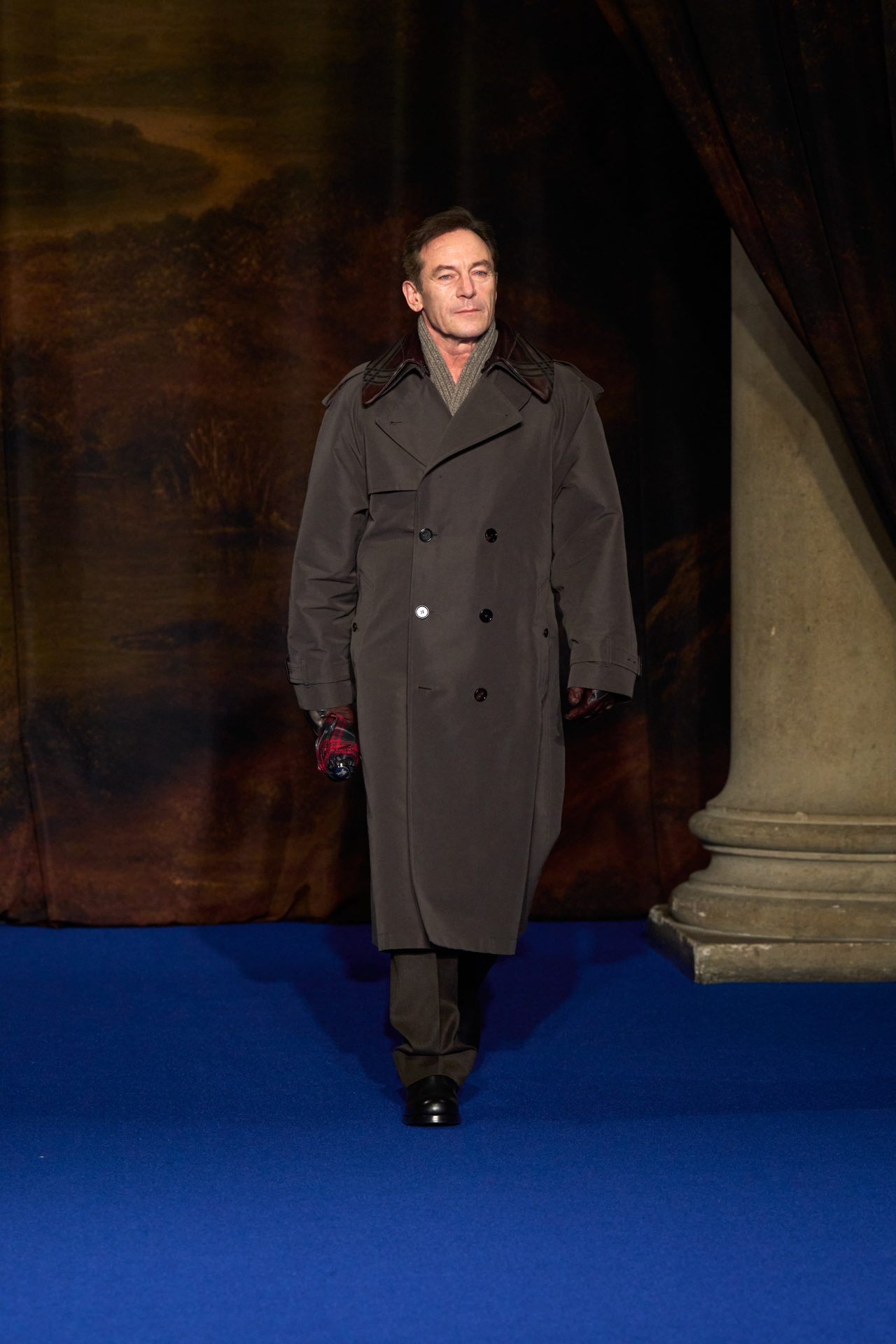 El front row fue tan impresionante como la colección. Celebridades como Kim Cattrall, Jodie Turner-Smith, Rosie Huntington-Whiteley y Brooklyn Beckham con su esposa Nicola Peltz-Beckham brillaron con looks que combinaban tonos tierra y estampados de cuadros Burberry. La presencia en la pasarela de figuras icónicas como Naomi Campbell, Elizabeth McGovern y Jessica Madsen y Jason Isaacs reforzó la conexión de la marca con la cultura británica. Incluso un misterioso «caballero» vestido con una armadura del siglo XV robó miradas, añadiendo un toque teatral y enigmático al evento.