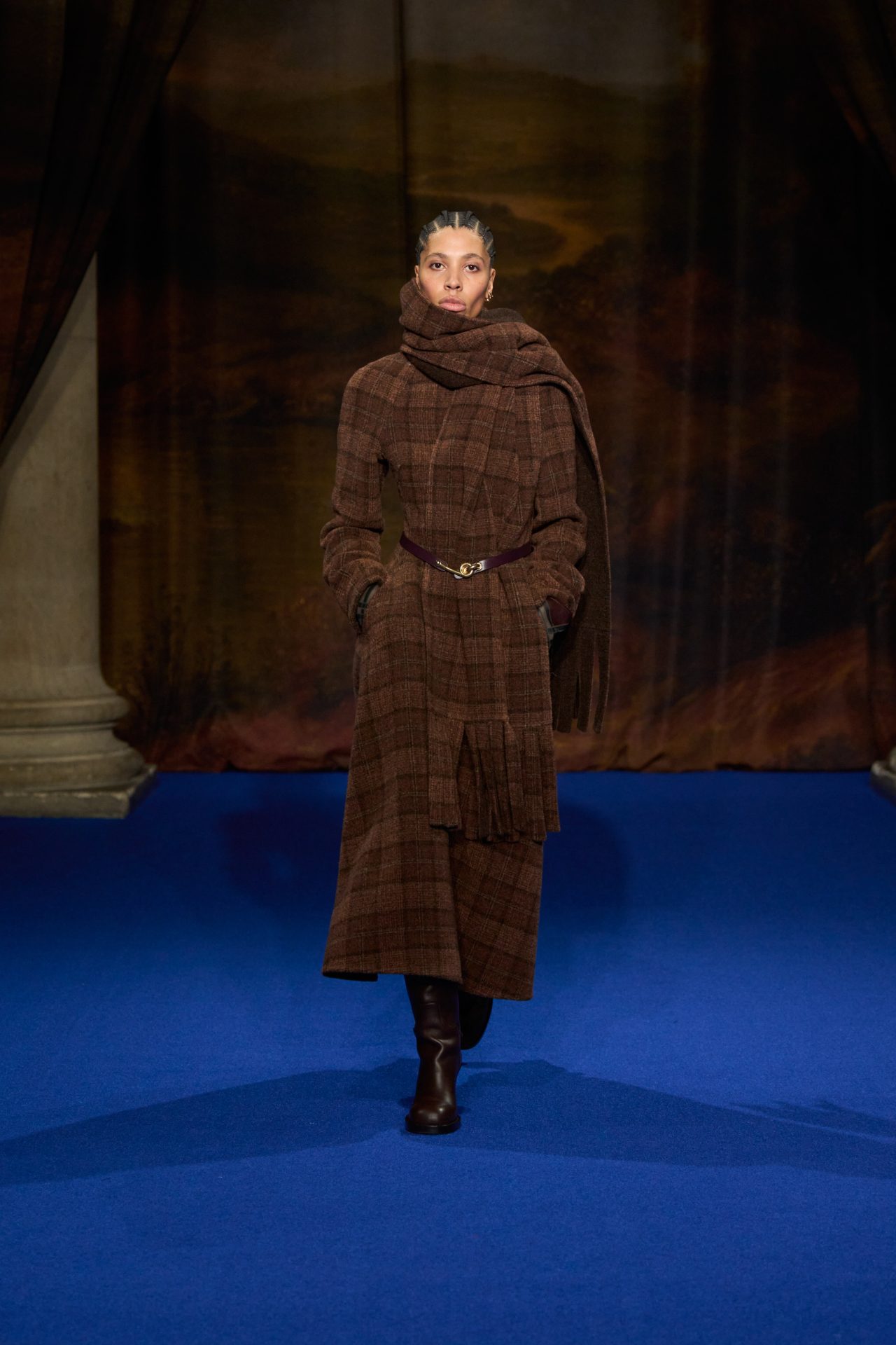 La London Fashion Week cerró con broche de oro gracias a Burberry, que presentó su colección Otoño/Invierno 2025 en la icónica Tate Britain. Bajo la dirección creativa de Daniel Lee, la marca británica transportó a los asistentes a un viaje por la campiña inglesa, fusionando la elegancia clásica con un toque contemporáneo. La pasarela, enmoquetada en un audaz azul Burberry, sirvió como escenario perfecto para una colección que rindió homenaje a la herencia británica, con abrigos largos, bufandas, estampados de cuadros escoceses y accesorios inspirados en la vida ecuestre. Lee logró capturar la esencia de los viajes al campo y la nobleza inglesa, creando una narrativa que mezclaba lo rural con lo urbano.