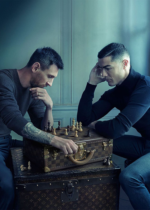 El 2017, Magnus Carlsen y Hikaru Nakamura llevaron a cabo en Noruega una de las partidas más famosas de la historia reciente del ajedrez, esta acabó en empate. Un día antes del inicio de la Copa del Mundo de Qatar 2022, Lionel Messi y Cristiano Ronaldo protagonizaron “la foto del año”, recreando la final de aquella partida sobre el conocido monograma de Louis Vuitton en uno de sus baúles. Las piezas fueron estratégicamente dispuestas de modo que no se mostrara favoritismo a ninguno de los futbolistas. Esta imagen, evidentemente, causó furor en redes sociales, el motivo no sólo se reduce a los dos jugadores, sino a todo lo que implicó la campaña.