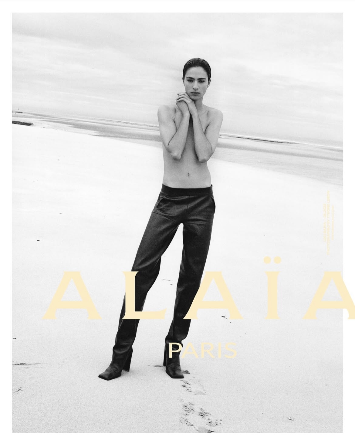 Por primera vez en la historia de Alaïa, la maison presenta una campaña creada como un auténtico relato cinematográfico, donde fotografía y video dialogan en una misma narrativa. En blanco y negro, esta propuesta cobra vida a través de videos dirigidos por Frank Lebon y capturas fotográficas de Tyrone Lebon, trasladándonos a un escenario tan natural como poético: las costas del norte de Francia, entre Cap Blanc-Nez y Cap Gris-Nez. Arena, mar, viento y acantilados envuelven a modelos con gesto nostálgico y rostros encapuchados, formando paisajes crudos que proyectan una moda silenciosa, impregnada de feminidad libre y una invitación a mirar más allá de lo tangible.