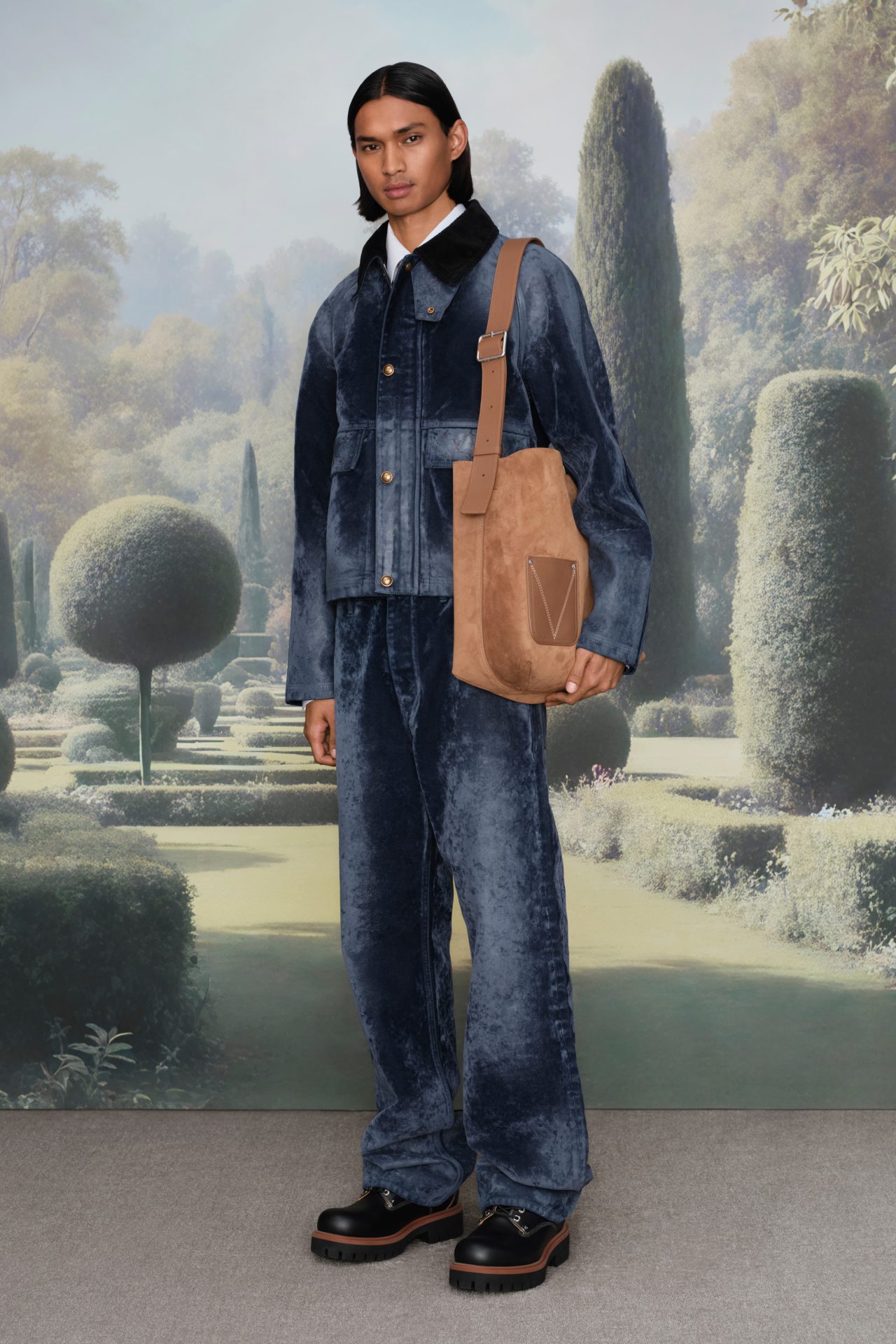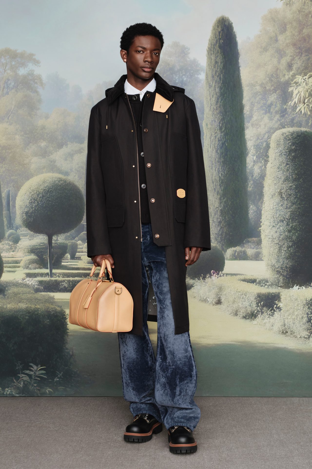 Hay humor, sí. Hay ironía. Pero también hay una visión firme: la moda no es un espejo, es un filtro. Y Pharrell lo sabe. Por eso convierte el dogwear en statement. Hay bolsos con forma de pointer, beagle y zorro. Trunks que también son camas. Collares para perros o para humanos, da igual. En esta colección, los accesorios no acompañan: ladran, dominan, marcan territorio. El aire británico se respira en los cuadros, en las chaquetas sin cuello, en los suéteres tipo cricket. Pero la silueta es contemporánea, casi poshumana: piernas alargadas por los cortes boot-cut, torsos ceñidos en shearling teñido, cuerpos envueltos en materiales nobles con la misma naturalidad con la que uno se pone un impermeable para salir a la lluvia.
