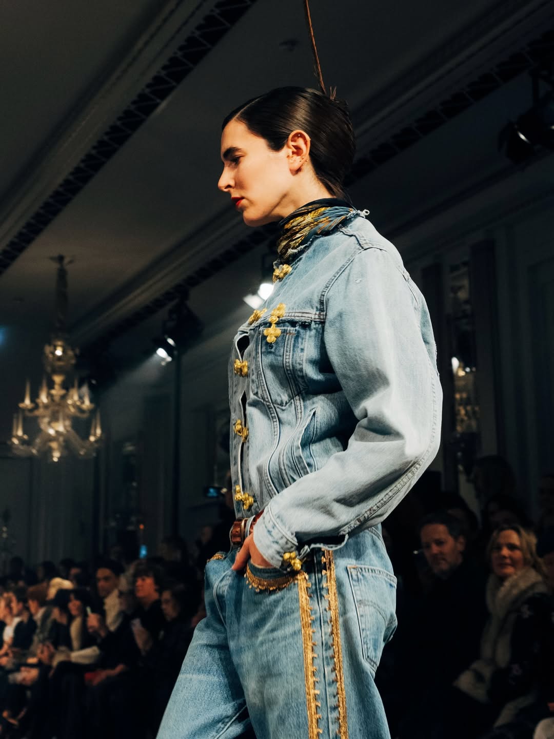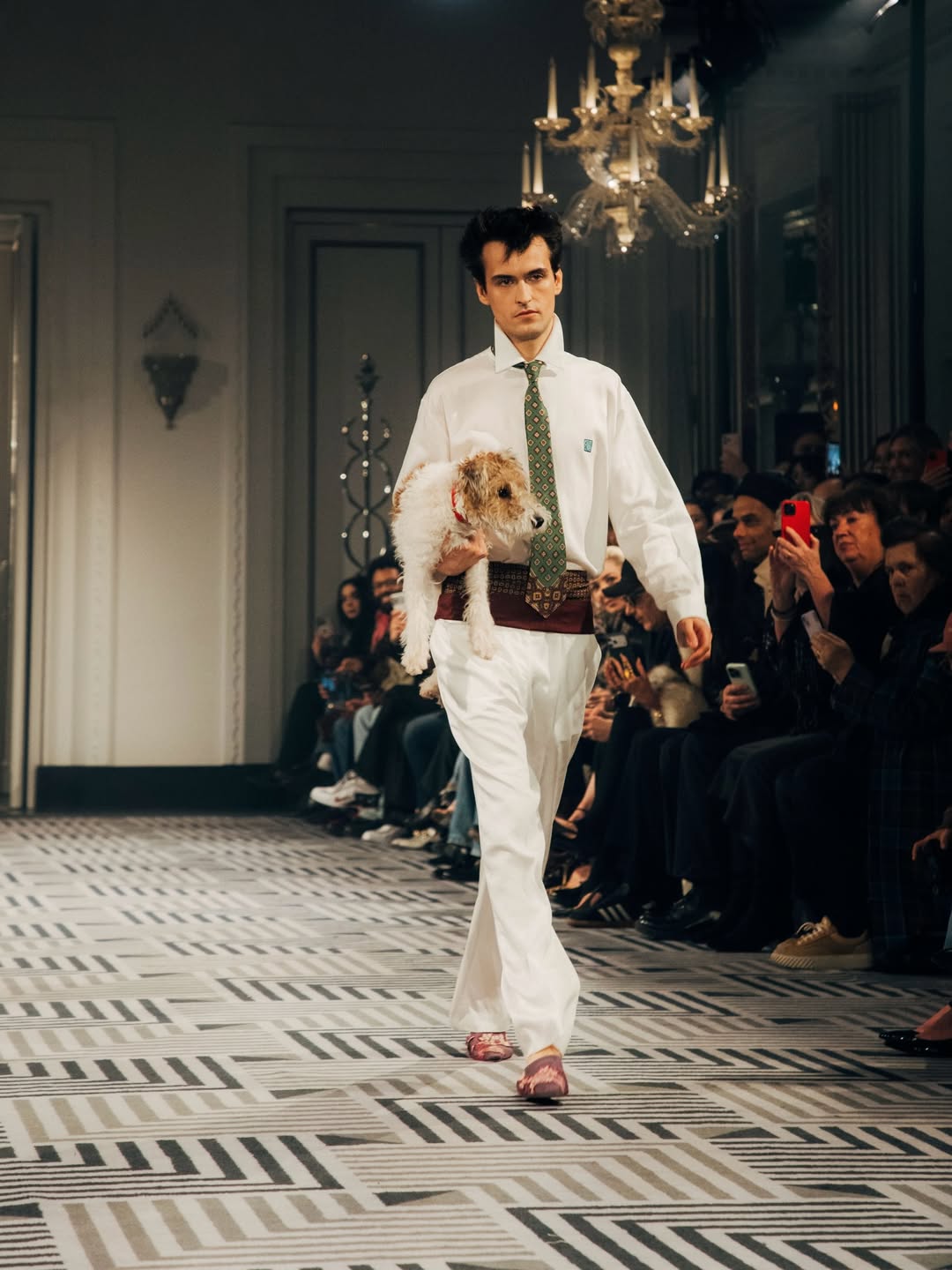 Uno de los elementos protagonistas fueron los pañuelos. Plisados al cuello, transformados en vestidos largos y cortos, como también integrados en distintas capas, se convirtieron en un recurso constante que reforzó esta idea de memoria resignificada. Más que un accesorio, funcionaron como un gesto estilístico que conectaba las piezas entre sí. Los detalles, bordados a mano, aplicaciones y juegos de silueta, aportaron carácter a cada look, creando un diálogo interno entre prendas dentro de un mismo conjunto. En Eldorado, cada pieza parecía tener historia propia. Con esta colección, Conner Ives vuelve a insistir en que la moda puede reinterpretarse y reutilizarse sin perder identidad. La estética del recuerdo, en sus manos, no es nostalgia vacía: es una forma de avanzar.