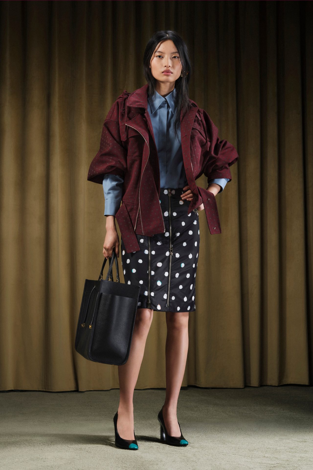 Inspirada en una fotografía suya de los años 80 —en la que aparece en un club nocturno con un vestido de lunares al lado de Karl Lagerfeld—, Silvia canaliza la nostalgia en una reinterpretación moderna que no se limita a mirar hacia atrás. La prenda original, con su fruncido peplum y espíritu festivo, resurge ahora con paracaídas de seda y bolsillos ocultos, pensados no solo para lucir bien, sino también para funcionar en la vida cotidiana. Es ese cruce entre forma y utilidad el que guía toda la colección.