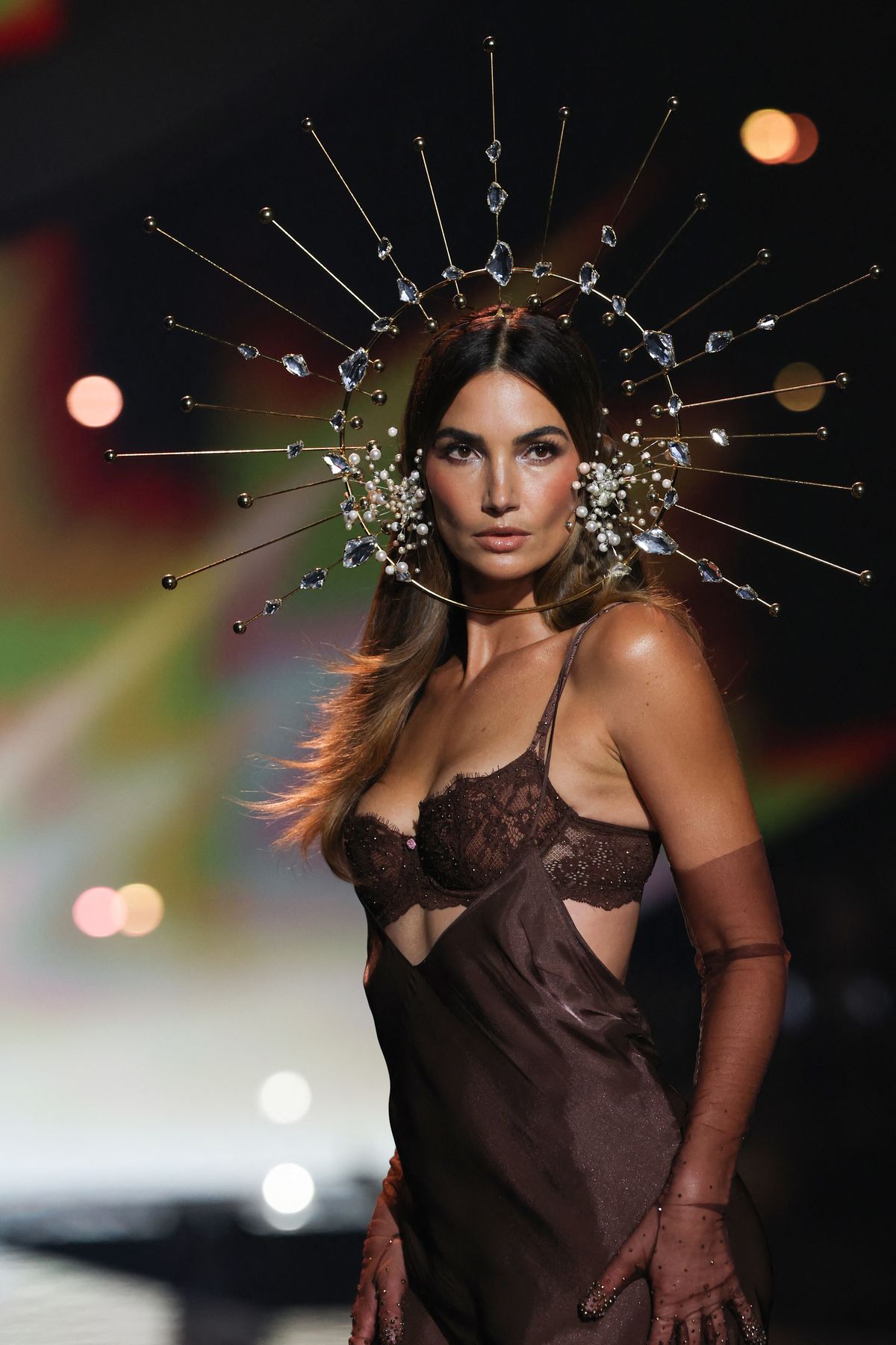 Entre los looks, el que se llevó todos los halagos fue sin duda el de Bella: un conjunto rojo intenso que incluía sujetador, tanga, medias y una bata satinada, proyectando dramatismo y elegancia. Aunque el look no incluyó alas, la imagen de la modelo, replicada en redes de forma viral, condensó el espíritu del show: el retorno del espectáculo visual, la fantasía y el poder de la moda en escena. Hubo además encajes negros, piezas metálicas y transparencias bordadas que destacaron la técnica artesanal y el trabajo con texturas, cortes y volumen. Cada look parecía pensado para equilibrar sensualidad, teatralidad y fuerza femenina.