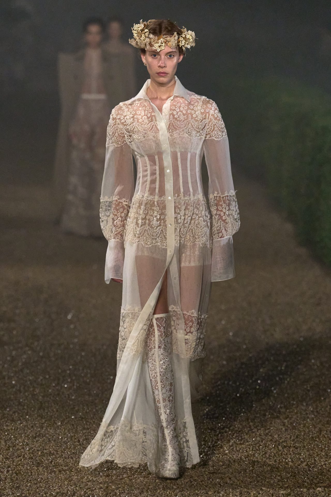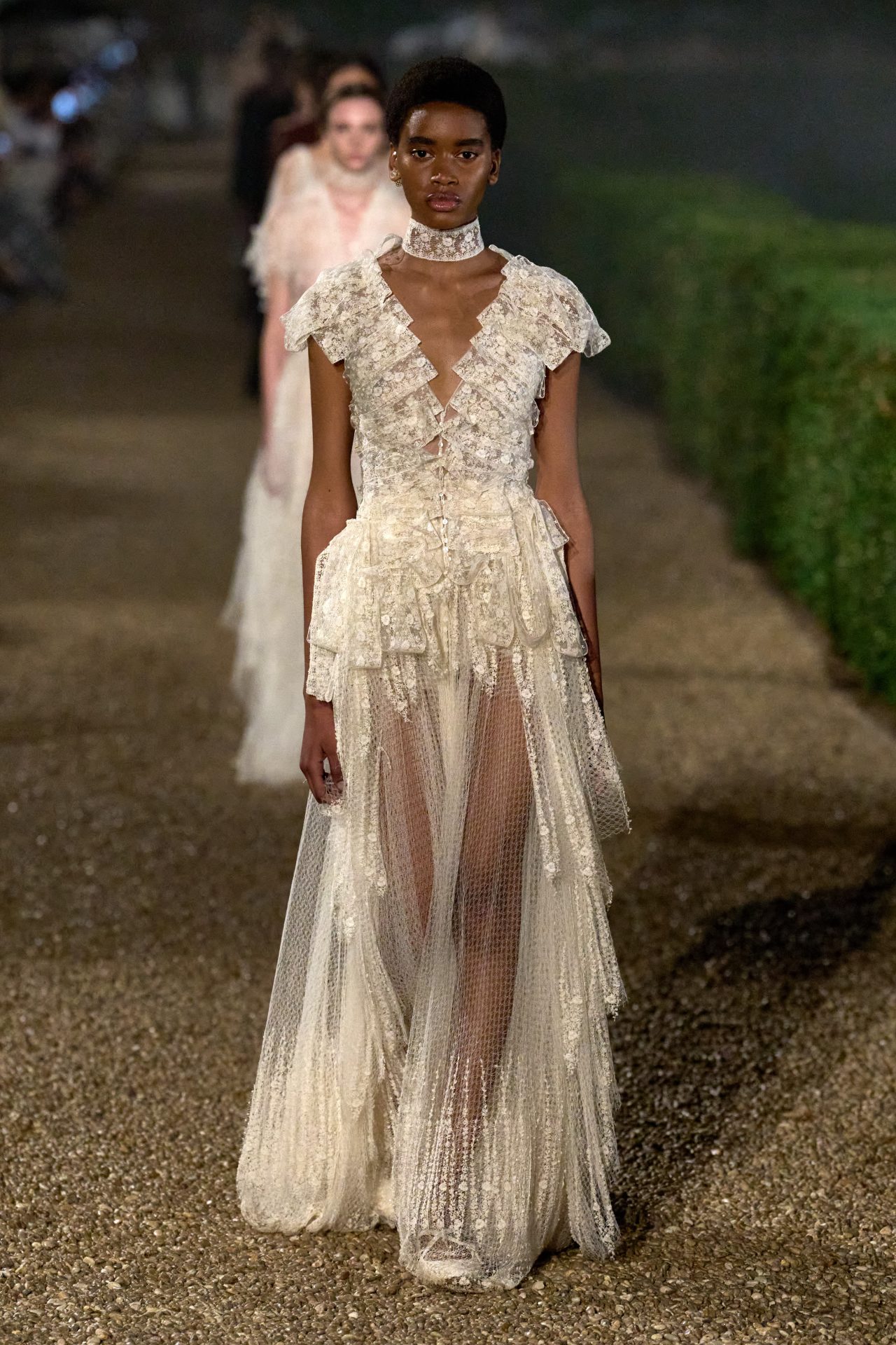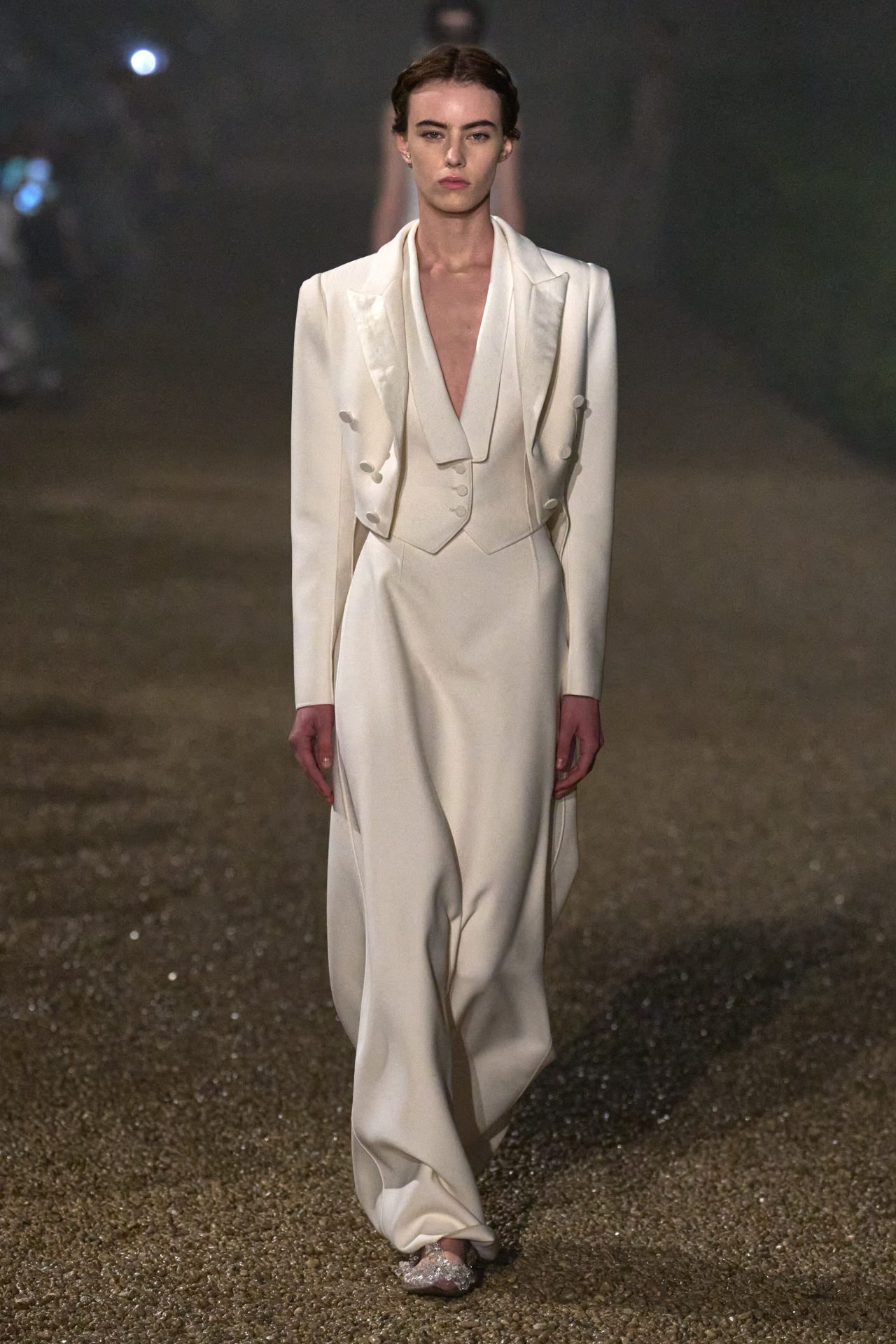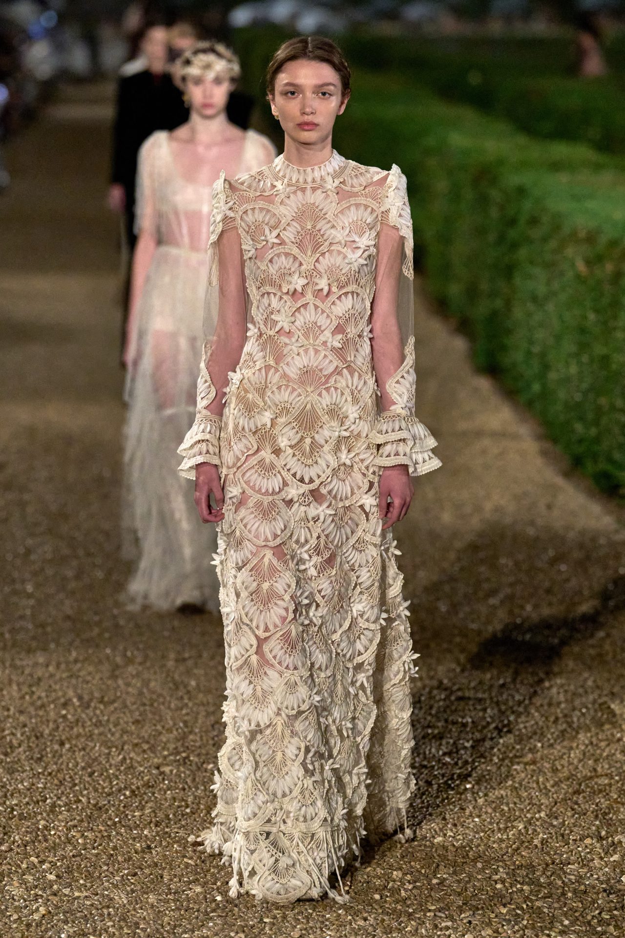 La propuesta de la diseñadora parece hablarle a una nueva generación de feministas que no necesitan llevar eslóganes bordados para afirmar su postura. Mujeres que conocen las reglas del feminismo, pero no lo ostentan; lo incorporan de manera íntima y reflexiva. Los trajes de cachemir perfectamente cortados, las túnicas de gasa translúcida, los bordados que imitan estructuras arquitectónicas romanas: todo remite a una figura femenina que no necesita ser vista como poderosa, porque simplemente lo es. Y en esa elección estética —donde la suavidad no implica debilidad— está contenida una declaración política.