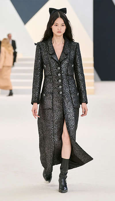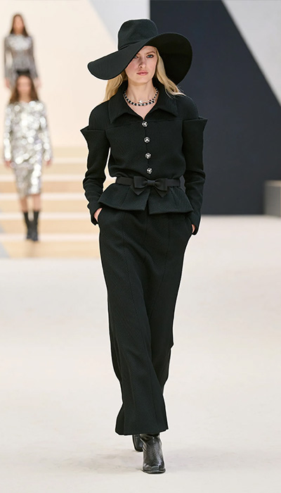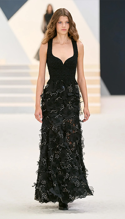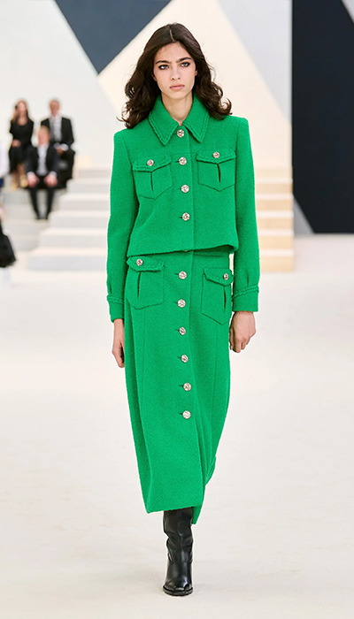 “En esta nueva colección hay trajes, vestidos largos como los imaginó Madmoiselle Chanel en los años 30: ceñidos al cuerpo aunque aquí tienen hombros marcados, y vestidos plisados como el vestido de novia por ejemplo. Encajes también, con incrustaciones, reelaborados, no bordados, sino repintados. La paleta consiste en verde brillante, caqui, beige, rosa, mucho negro y plata”, describió la directora creativa de la firma. Y así como hace mención y referencia a Cocó Chanel, también hay ciertos detalles que dejan entrever sus épocas como aprendiz de Karl Lagerfeld. El constructivismo de la decoración “gráfica”, una palabra clave para el difunto diseñador, fue predominante.