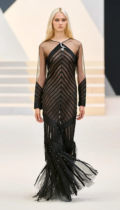 Quizás el motivo por el que cuesta ver la colección como haute couture es porque, como explica Virginie Viard, la indumentaria está para vestirla: “La ropa sigue siendo ligera, femenina, diseñada para ser usada. No me veo haciéndolo de otra manera. El centro ecuestre L’Etrier de París en el Bois de Boulogne albergó un espectáculo embriagado por el art deco, la banda sonora sinfónica de Sebastien Tellier y la pantalla gigante con un clip impresionista en el que participaron Charlotte Casiraghi y Pharrell Williams. El eclecticismo no se limitó a la presentación en sí, los diseños también. Increíbles textiles con todo tipo de técnicas fuera de lo común: encajes pintados en resina, una lluvia de hojas bordadas sobre un vestido trapecio de tul blanco, plumas de avestruz aplicadas sobre gasa negra, entre otras cosas.