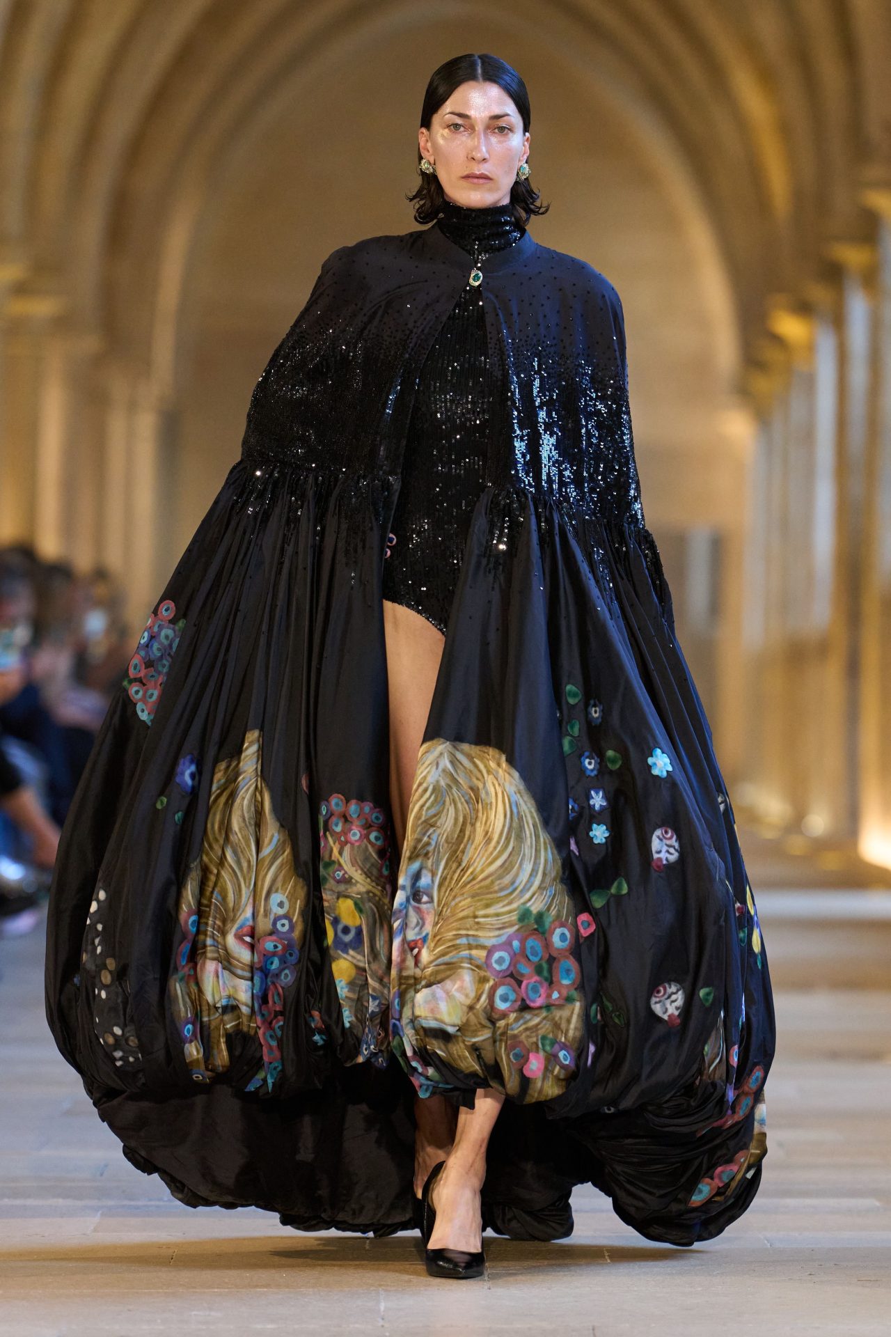 Por su parte, Rahul Mishra convirtió la pasarela en un viaje místico a través de las siete etapas del amor, según el sufismo, en su colección titulada “Becoming Love”. Desde una armadura dorada en forma de corazón hasta un vestido de flores flotantes que parecía pintado por Gustav Klimt, cada look encarnaba una emoción: atracción, entrega, obsesión y hasta muerte. Celebrado en una catedral parisina, el desfile tuvo momentos de espectacularidad (Cardi B incluida) y otros de introspección. Mishra, como siempre, tejió símbolos, espiritualidad y bordados meticulosos en una experiencia que va más allá de la estética: “El amor trasciende la existencia”, dijo, y sus prendas lo susurraban en cada puntada.