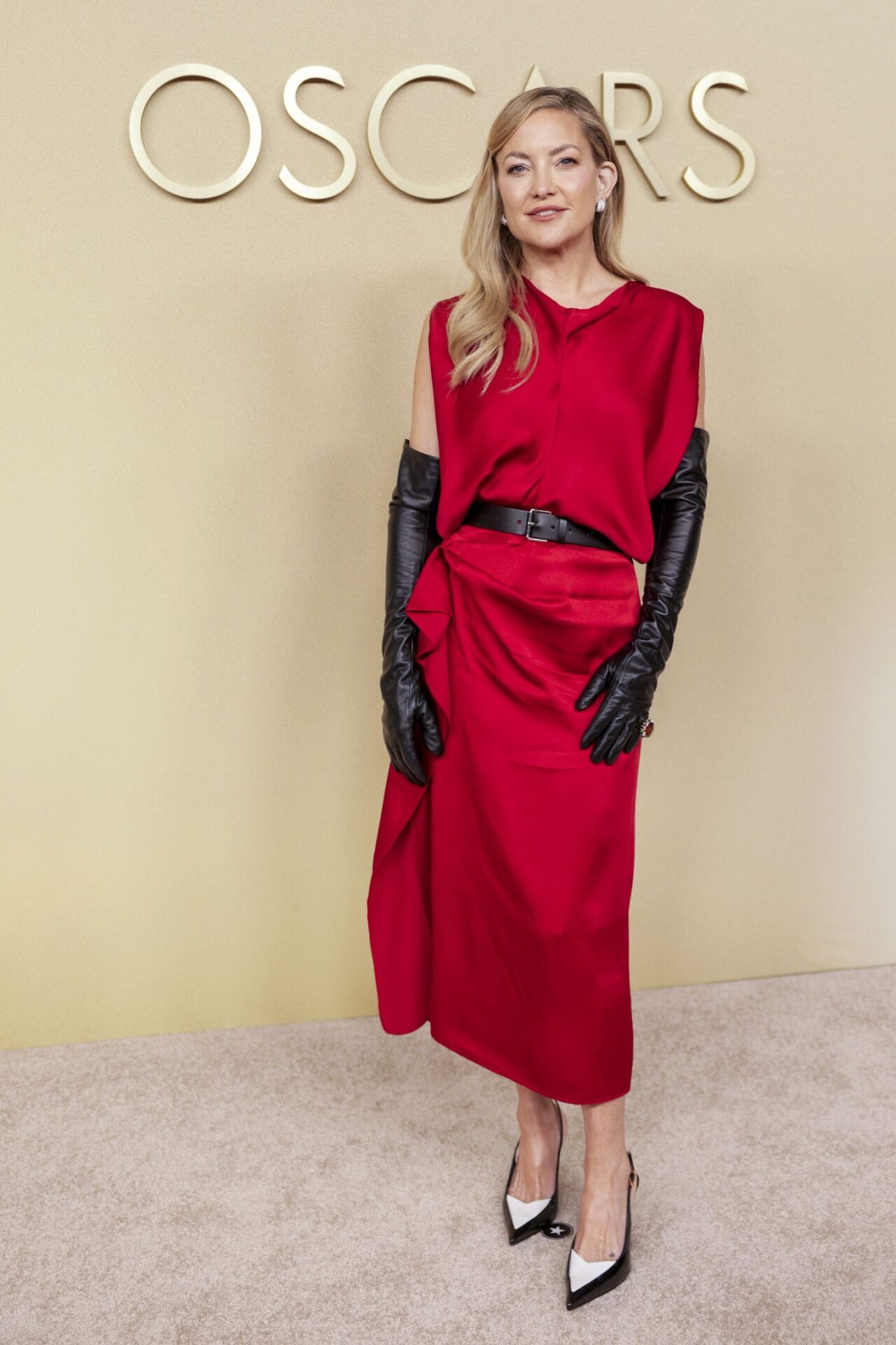 Entre los más comentados estuvo Emma Stone, nominada a Mejor Actriz por Bugonia. La actriz lució un blazer negro con hombreras a modo de vestido de la firma Julie de Libran. El escote pronunciado y la flor en la solapa le dieron un aire elegante, minimalista y súper chic. Kate Hudson, también nominada a Mejor Actriz, apostó por un look más clásico pero igual de impactante: un vestido rojo satinado de Lanvin, combinado con guantes negros y cinturón, que recordó al glamour de Hollywood de los años 50 con un toque moderno.