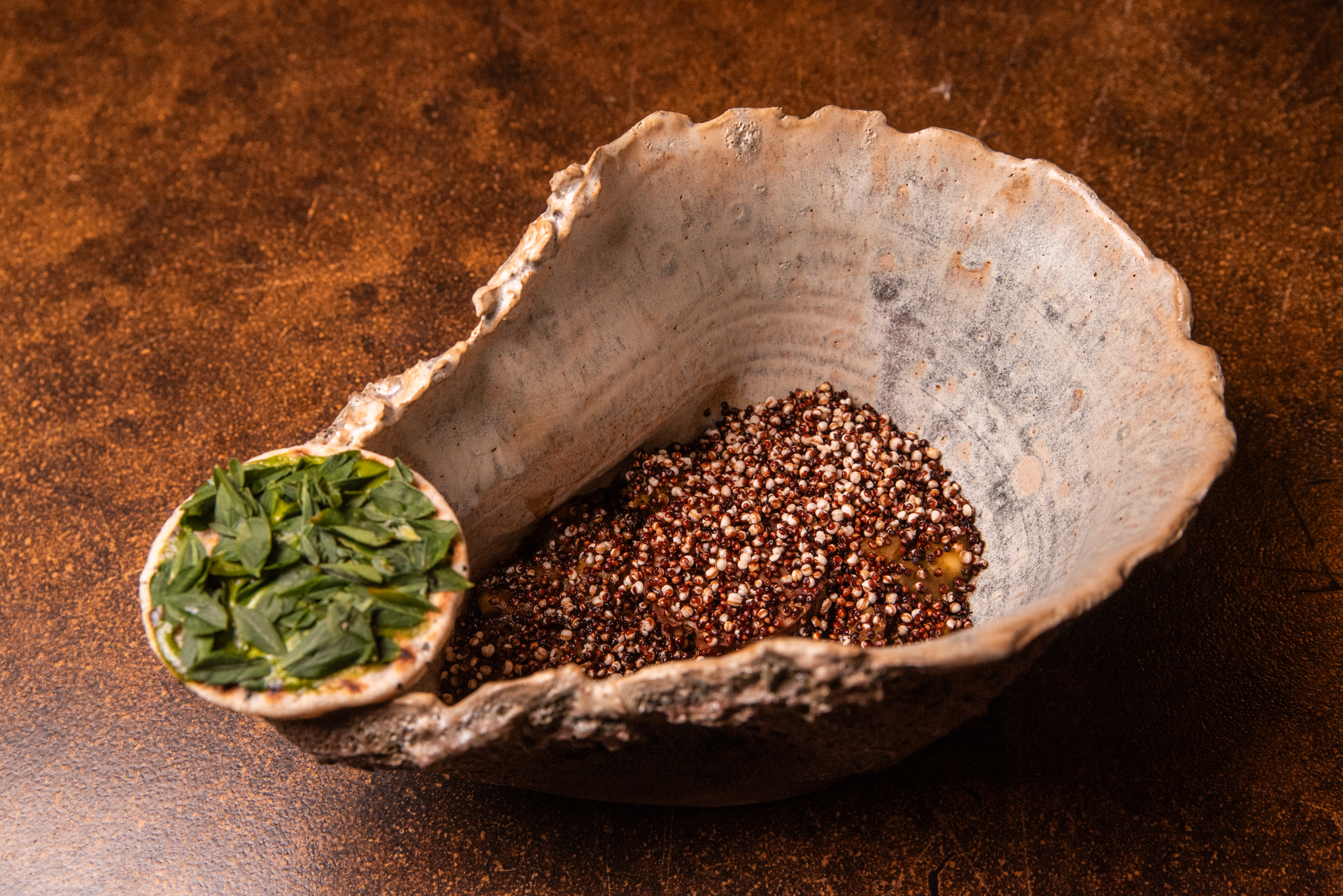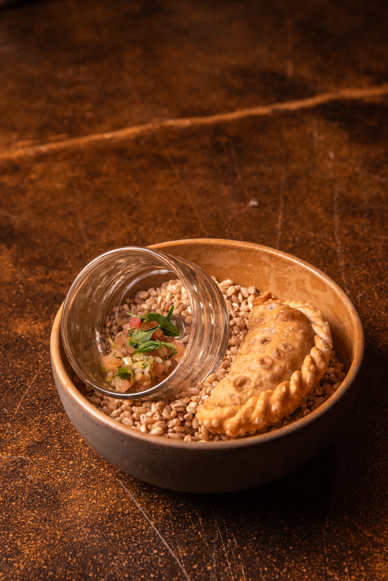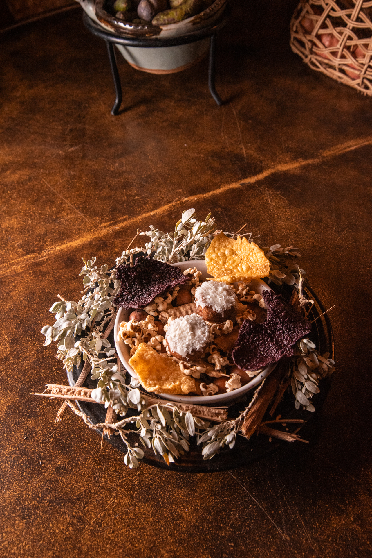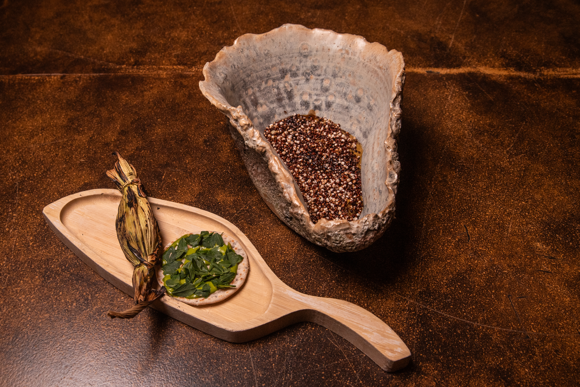 Avilés diseñó un menú degustación en pleno desierto, acompañado de un maridaje orgánico de Viña Miguel Torres, en el que interpretó los paisajes y sabores del altiplano: desde hierbas recolectadas en la zona hasta productos que forman parte de la despensa atacameña. La propuesta incluyó creaciones que reinterpretan clásicos de la cocina nortina, como una empanada frita de guanaco con pebre de cachiyuyo, una lengua estofada con crema de papa andina y salsa de algarrobo, o una humita con charqui de llama y chicha de maíz dulce. El cierre dulce trajo también sorpresas, un sorbette de granadas fermentadas con gomita de hoja de coca y muña muña, además de una crema volteada de chañar, homenaje a uno de los frutos más emblemáticos del desierto.
