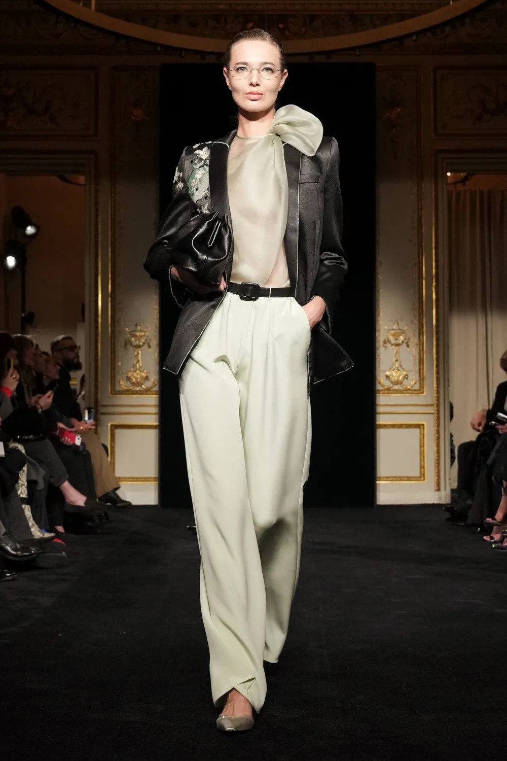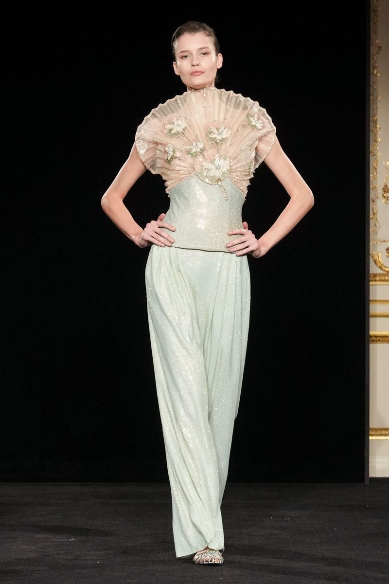 La pasarela abrió con sastrería masculina reinterpretada para la mujer, un recurso habitual de la casa, aunque esta vez presentado con ciertas actualizaciones: hombreras marcadas, pantalones de tiro alto con cortes más holgados y siluetas cargadas de movimiento. Esta primera parte del desfile transmitía una elegancia más “llevable”, para luego dar paso a propuestas ligeramente más audaces. A medida que avanzaba la colección, las transparencias, los bordados de inspiración asiática y las lentejuelas comenzaron a tomar protagonismo, desafiando de forma sutil el imaginario minimalista de la marca, sin perder sobriedad ni coherencia estética.