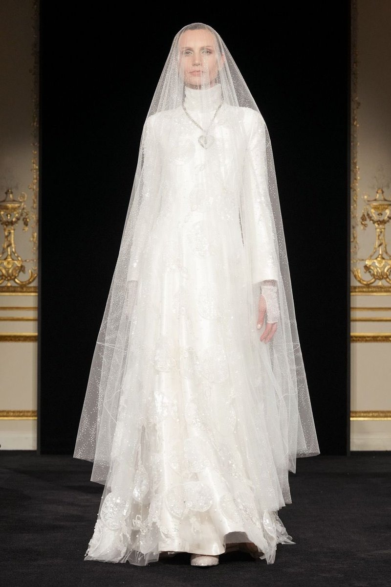 Como es costumbre en la alta costura, la novia Armani fue la encargada de cerrar el desfile. Vestía un diseño marfil de cuello alto y mangas largas, de líneas limpias y sin corsetería ni transparencias, acompañado de un velo translúcido que se extendía en una cola sutil. Su presencia imponía una autoridad serena, sintetizando la filosofía de Armani y recordando la visión atemporal de la casa.
