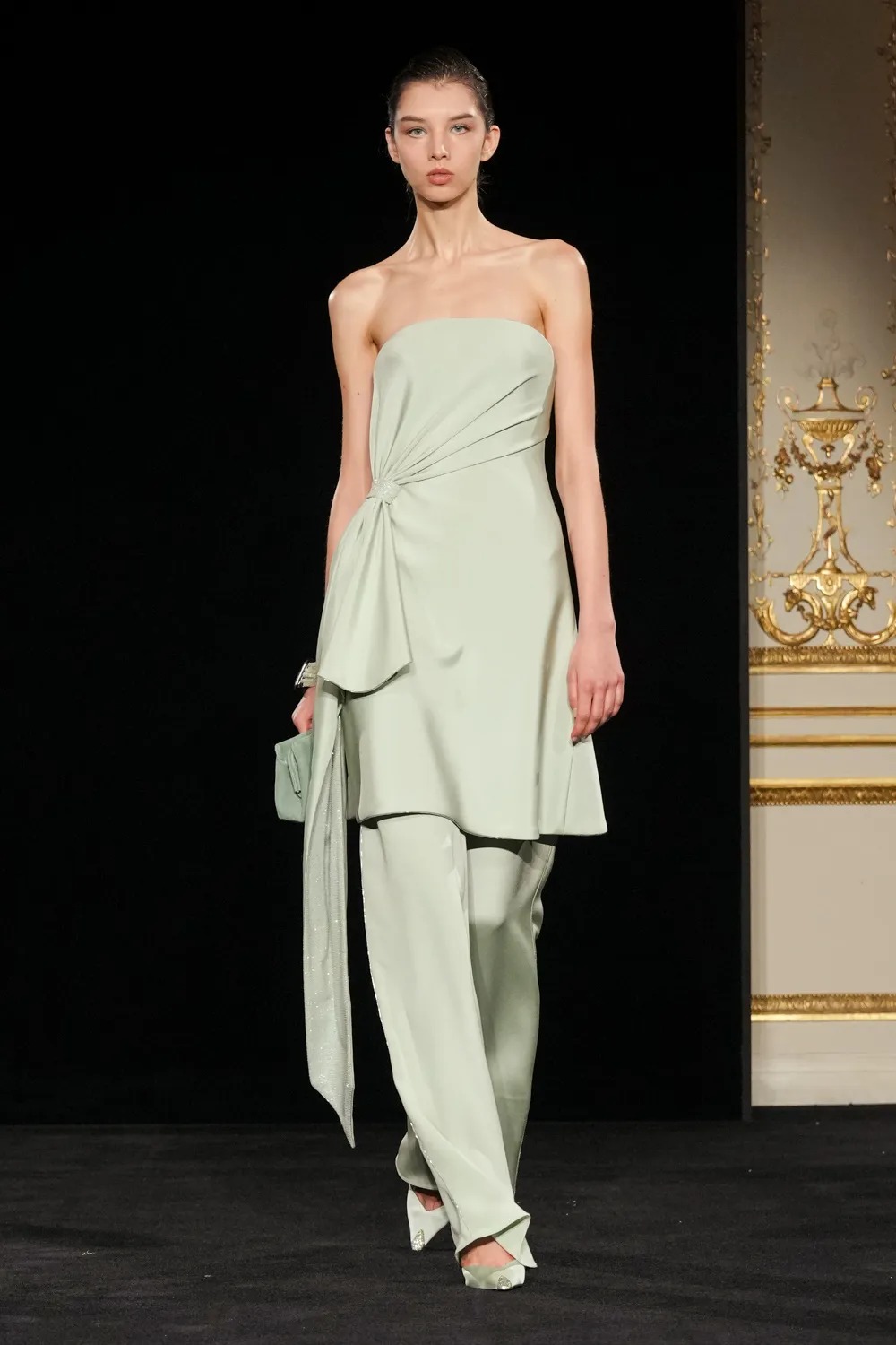 El nombre de la colección se hizo presente a lo largo de gran parte del desfile. El verde jade, protagonista absoluto, se desplegó en múltiples tonalidades, apareciendo en vestidos, chaquetas y pantalones, así como en distintos tejidos. Fiel a la tradición de la casa de construir sus colecciones en torno a un color o motivo central, esta paleta resultó reconocible, aunque claramente renovada.