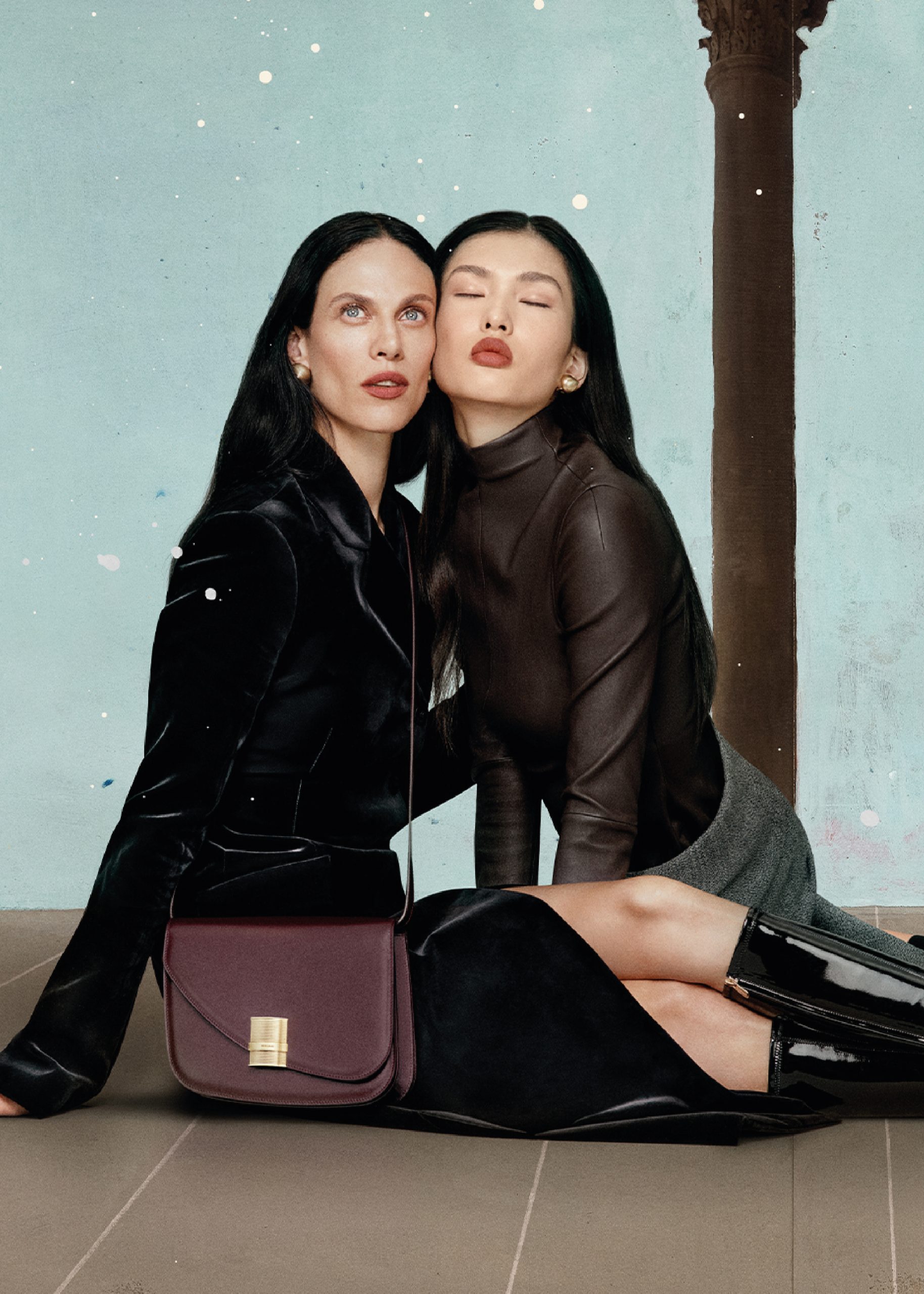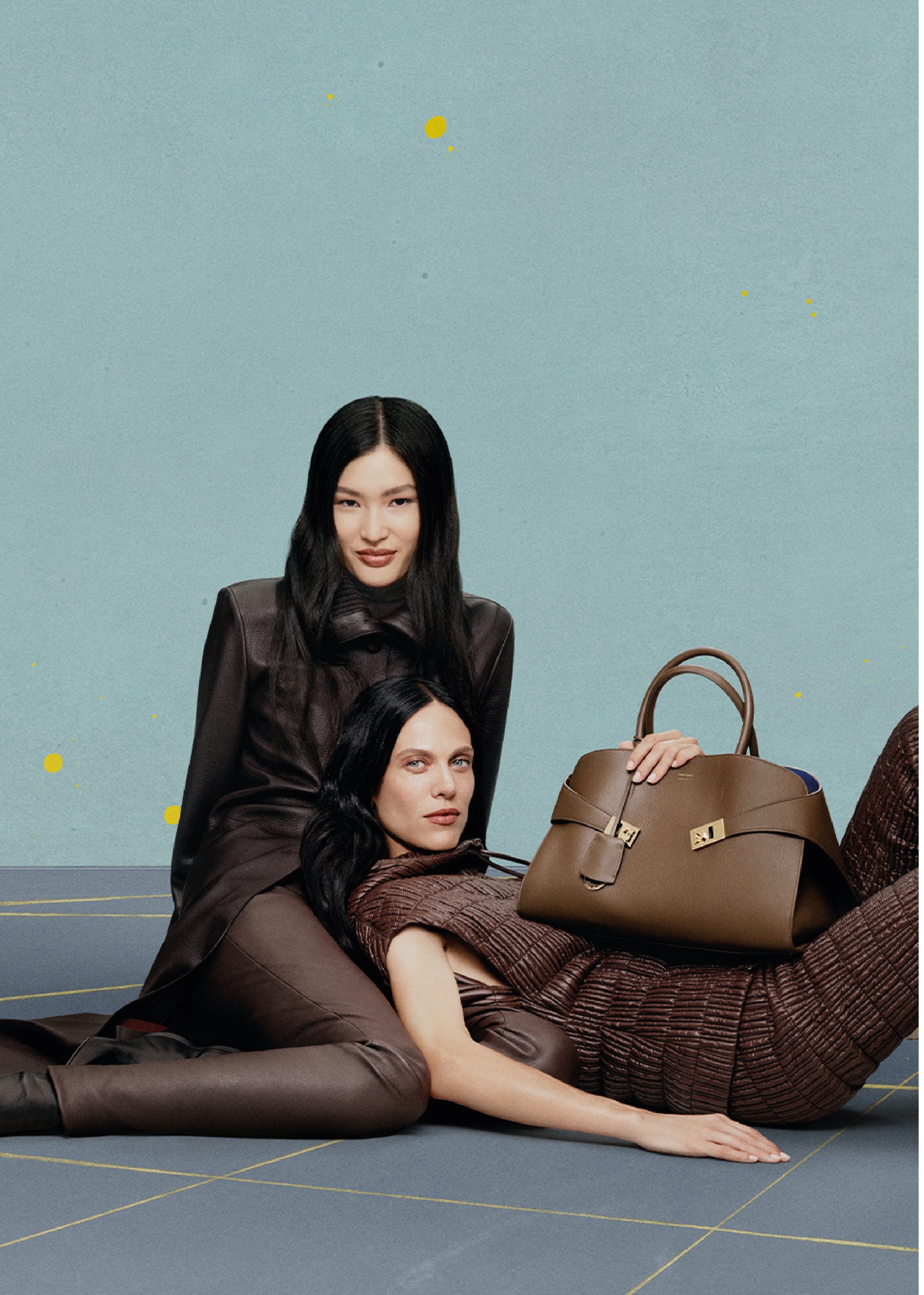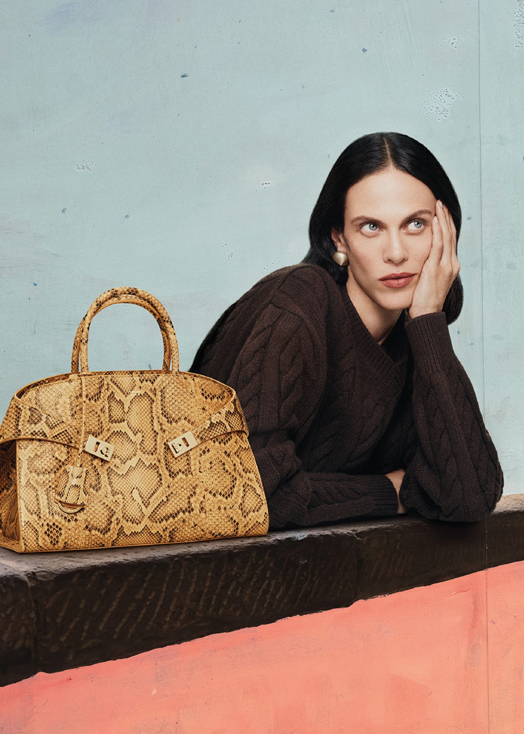 La campaña presenta looks exclusivos de la selección navideña 2023, que incluyen siluetas entalladas, piezas de denim y cuero, conjuntos après-ski y accesorios exclusivos como el bolso Hug, el bolso de hombro Fiamma, los mocasines Gancini y los slip-ons con detalles recortados, junto con una cuidada gama de regalos festivos que incluyen pequeños artículos de cuero en oro y plata, cinturones clásicos en tonos atemporales y bufandas suaves con el logotipo de Ferragamo.