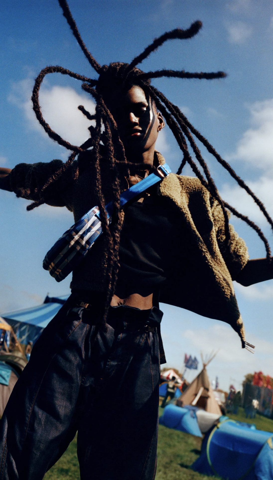La colección presenta prendas diseñadas para la funcionalidad y el estilo, adaptadas a las condiciones cambiantes del clima británico. Incluye trench coats renovados, parkas más ligeras, botas de goma y accesorios como bolsos cruzados y sombreros tipo bucket, todos con el característico estampado de cuadros de Burberry. La paleta de colores combina tonos tierra con toques más vibrantes, reflejando la diversidad y la energía de los festivales de verano. La apuesta por incluir figuras de diferentes generaciones y géneros musicales destaca el compromiso de la marca con la representación e innovación.
