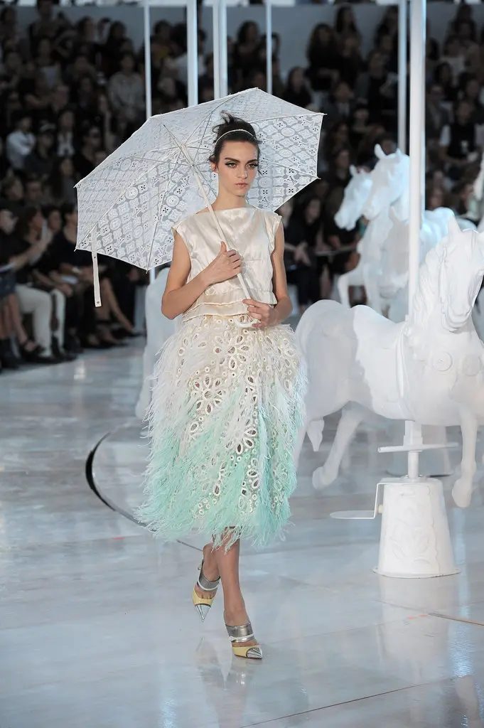 Todo esto ocurrió en el marco de la Semana de la Moda de París, un entorno ideal para plasmar la visión romántica del diseñador. Jacobs explicó a los medios que el carrusel representaba una metáfora del ciclo eterno de la moda, que gira una y otra vez, retomando referencias del pasado con una frescura inigualable. La propuesta estuvo cargada de tonos pastel, flores y plumas, logrando una estética femenina y sofisticada. Como broche de oro, la inigualable Kate Moss desfiló con un vestido blanco corto sin mangas, adornado con flores y plumas, dejando a todos boquiabiertos.