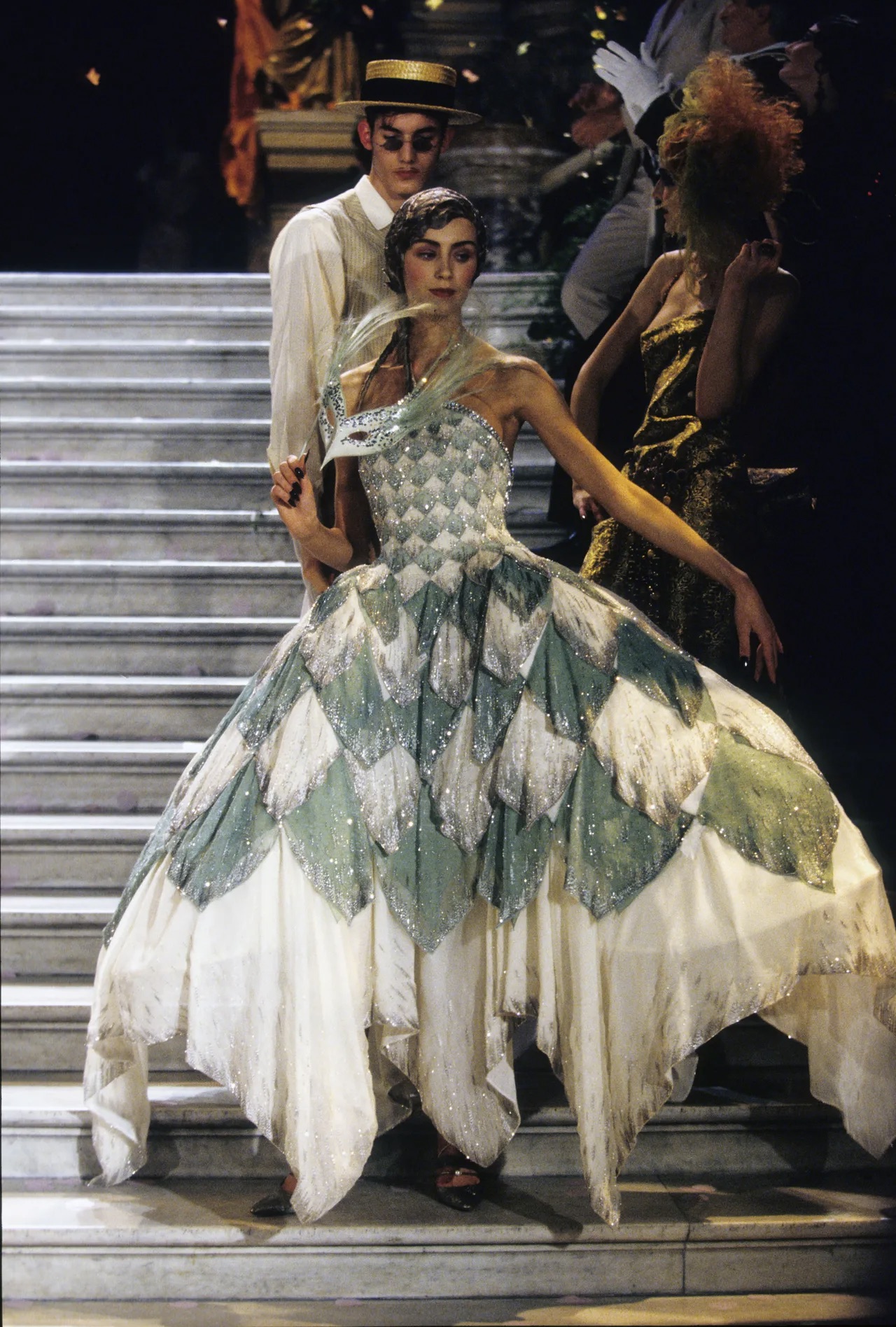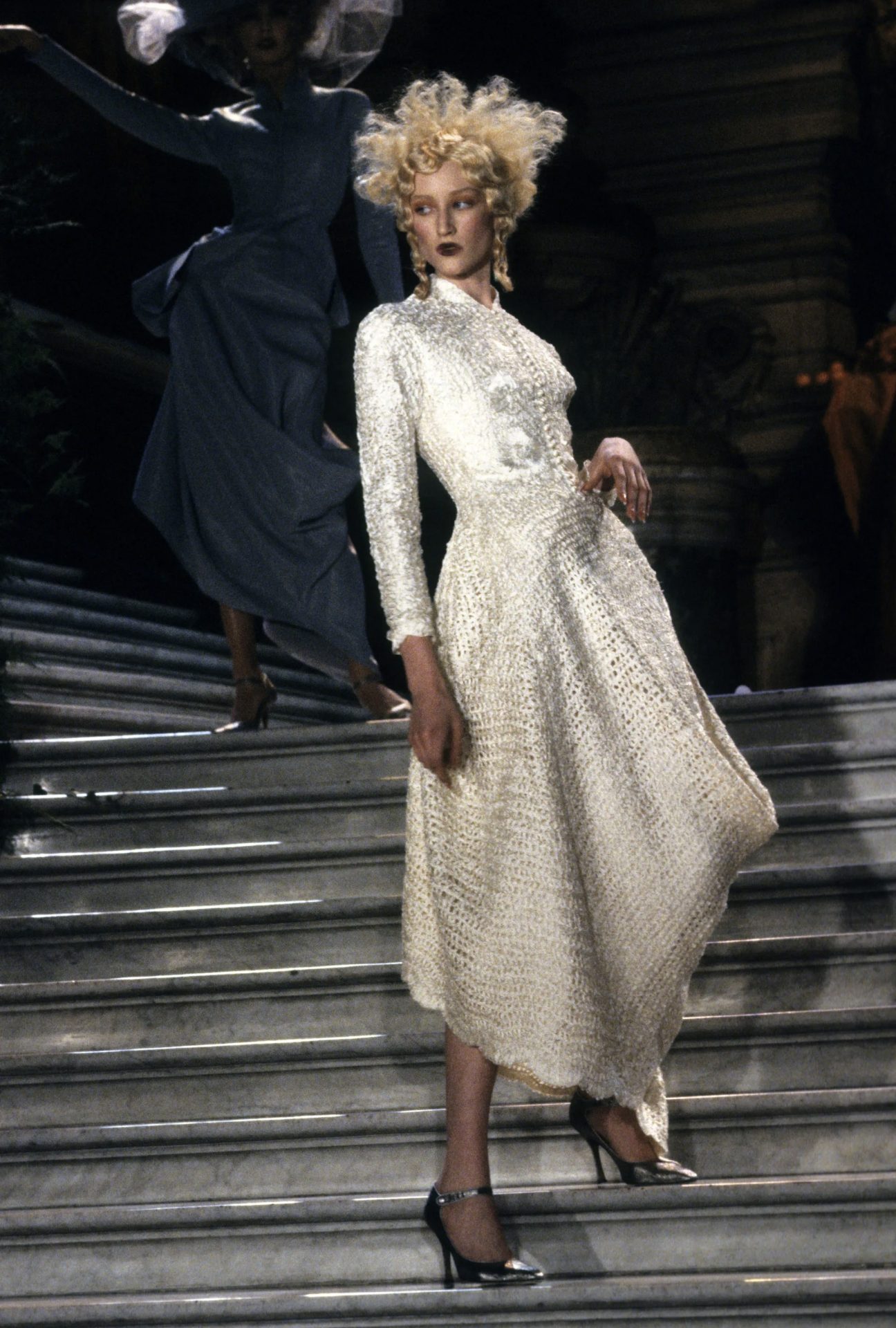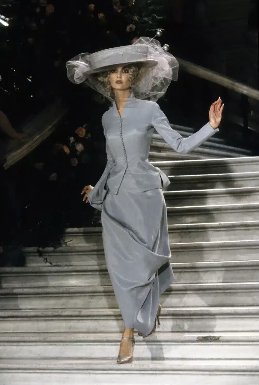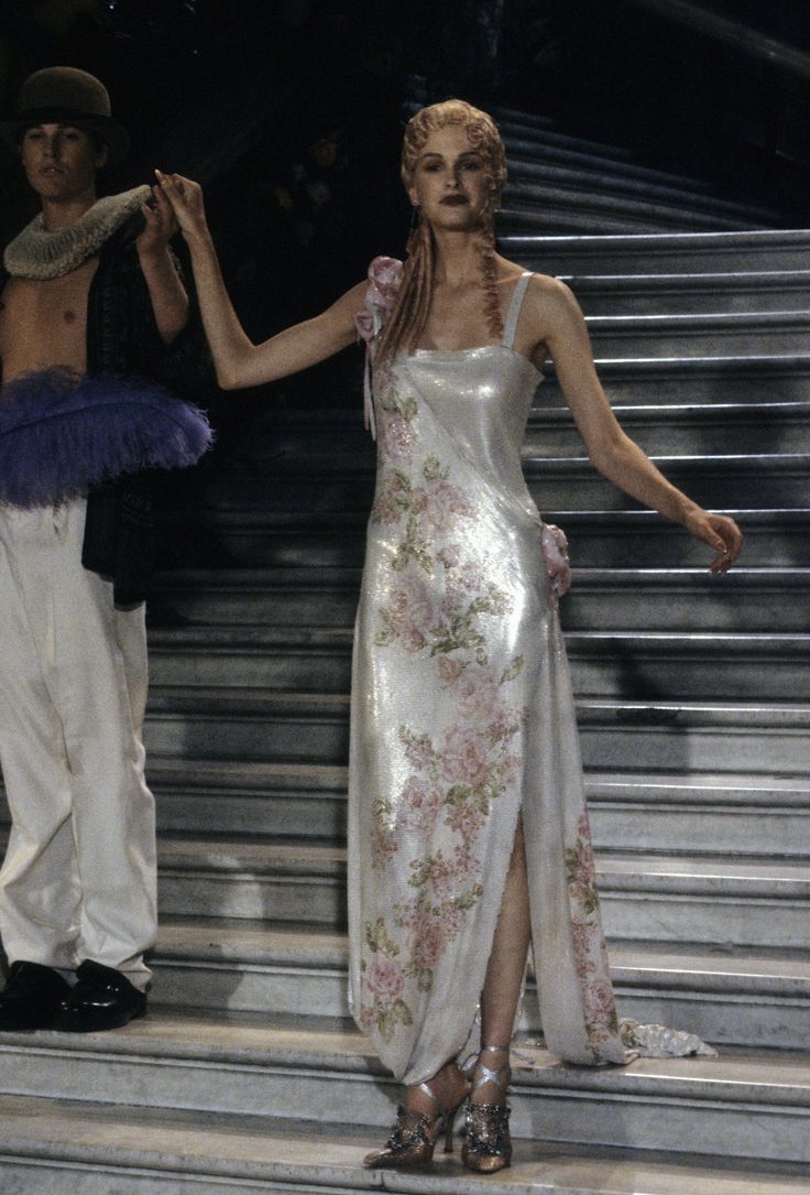 La pasarela, que parecía más una galería de arte que un desfile de moda, se llenó de siluetas exuberantes y románticas. Galliano se inspiró en el siglo XVIII y en la corte francesa, con reminiscencias de la pintura rococó, pero también de la opulencia barroca, llevando a la alta costura a un nivel de fantasía inédito. Los vestidos no solo tenían una belleza sublime, sino que parecían narrar una historia, como si cada uno fuera el personaje central de un drama épico. Galliano utilizó los códigos clásicos de la alta costura —tul, seda, organza, encaje— pero los reimaginó a través de su propia visión teatral. Los volúmenes extremos, las falda amplias como para una corte real, los corsés que abrazaban la figura femenina como piezas de arte escultórico, y las capas de tela que se desplazaban con gracia eran la base de una colección que hablaba de elegancia y poder. Cada vestido parecía un capítulo de una novela visual, con un dramatismo que evocaba los grandes relatos históricos y las tragedias románticas.