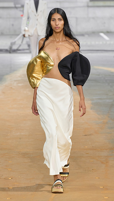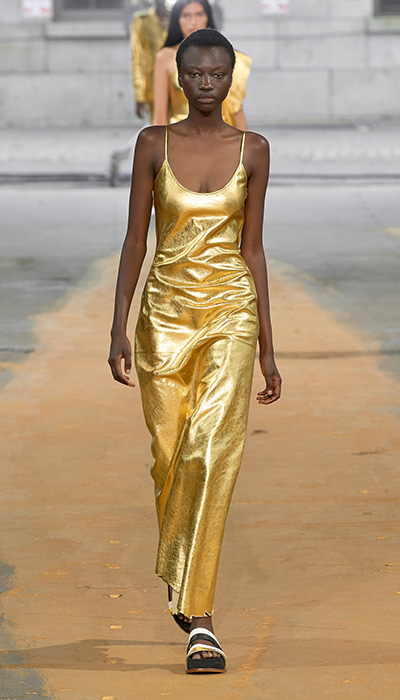 La colección de Primavera-Verano 2023 de Gabriela Hearts parecía hecha por completo de oro. Inspirada en la mitología griega, la diseñadora quiso representar la fuerza femenina a través de corazas, escudos y telas que, entrelazadas, cobran sentido. La historia de Safo, una poeta griega, es la que cobró vida en la entrega que, al mismo tiempo, demostraba su interés de ser altamente sostenible. Gabriela nació en Uruguay, en el seno de una familia que producía lana, rodeada de animales y un rancho que inspiraron en ella el amor por su entorno y la magia que había en su cuidado. “Todos nuestros materiales se investigan profundamente…no hay un solo material en esta colección que no haya aprobado o cuya composición no conozca”, dice.