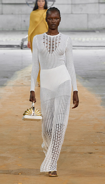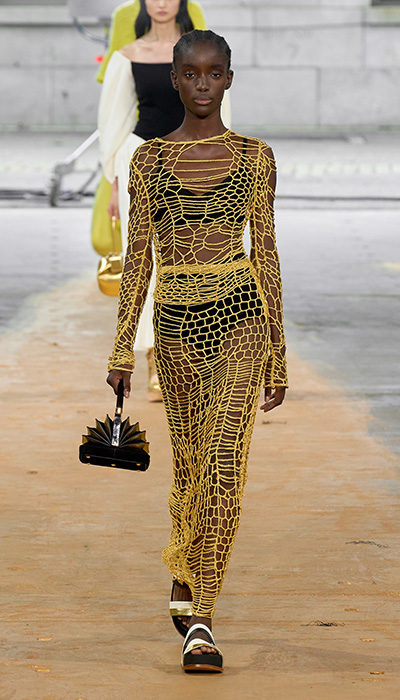 Lo más destacado sin duda, son las técnicas de elaboración que mayormente son hechas a mano. Un trabajo de artesanía clásico de la firma que justifica la exclusividad de sus productos y su valor. La propuesta de la pasarela de New York es diversa, donde a pesar de que dominaron los colores potentes como el dorado y el negro, fueron las piezas en color rojo y amarillo, como con fuego, las que mejor describen la colección. Lo de la sustentabilidad sí iba en serio, porque fue gracias a “Manos del Uruguay”, un grupo de artesanas que trabaja junto a la diseñadora para crear las prendas de punto. Hilos que dejaron entrever mucha piel, con vestidos y enteritos con delicadas extensiones de crochet u otra técnica.
