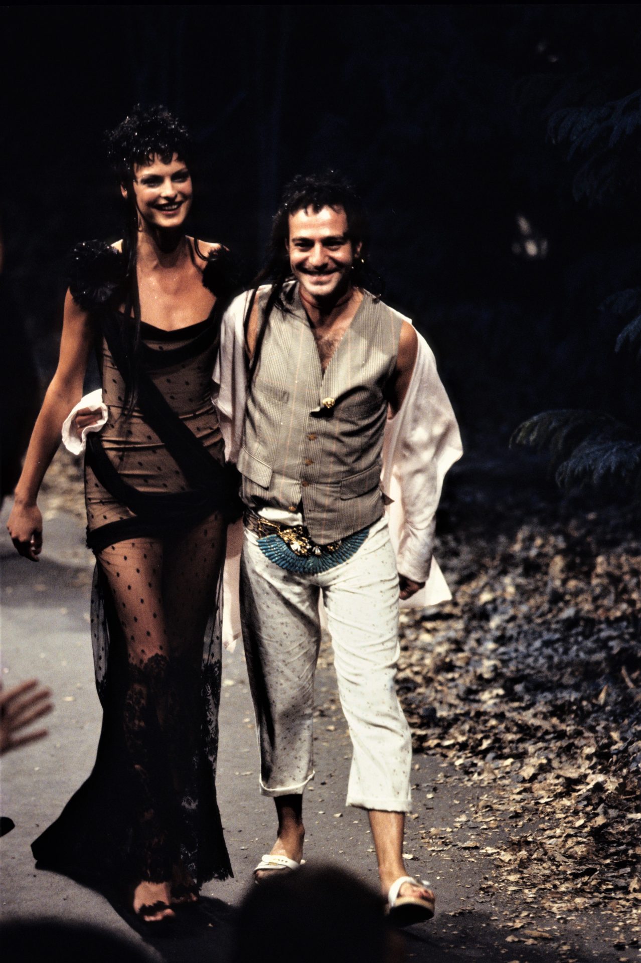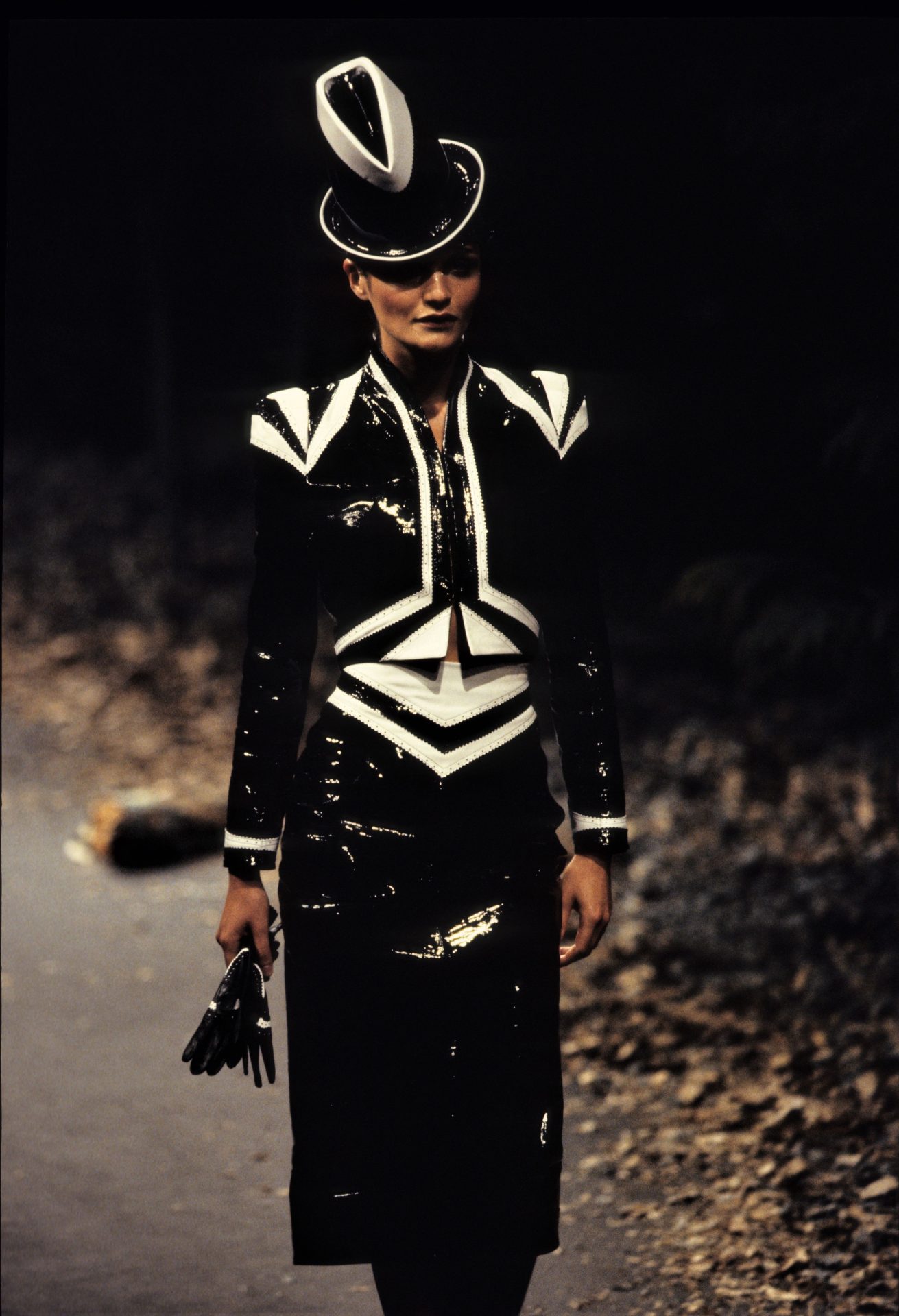 Antes de convertirse en el fantasma enmascarado de Margiela, John Galliano ya había escrito su nombre en letras teatrales en la historia de la moda. Nacido como Juan Carlos Antonio en Gibraltar, se formó en la Central Saint Martins con una sensibilidad afilada para el drama, la historia y la belleza poco convencional. Esa misma visión lo llevó en 1995 a ser el primer diseñador británico en dirigir una firma francesa de alta costura: Givenchy. Aunque su estancia fue breve, dejó una huella inconfundible al cambiar a la musa Audrey Hepburn por Amanda Harlech, e introducir una estética cargada de referencias históricas, sátira y nocturnidad londinense.