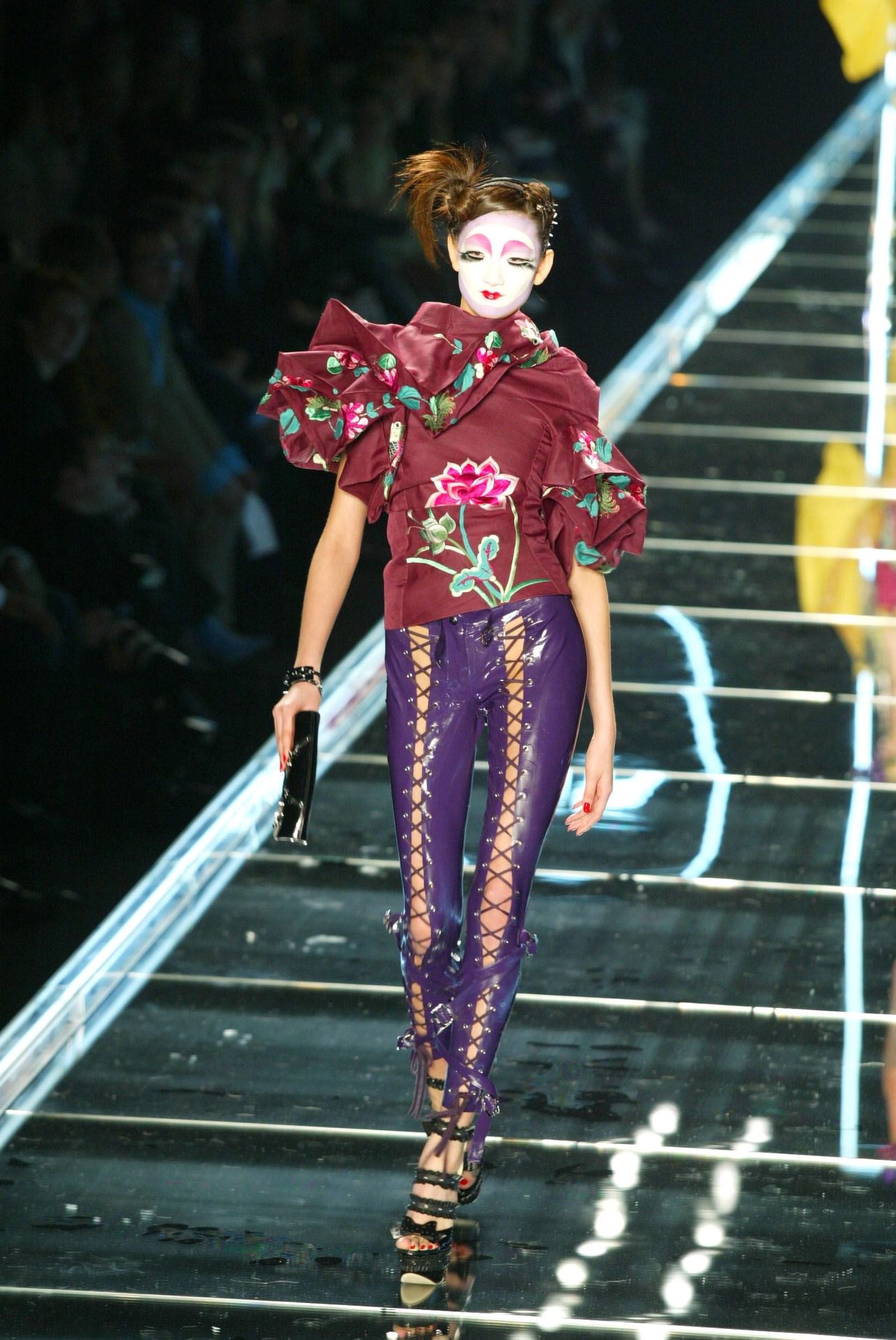 Un año después, en 1996, Bernard Arnault apostó por él para Dior. Galliano desembarcó en la maison como un director de cine barroco: escenografías monumentales, maquillaje a cargo de Pat McGrath, tocados de Philip Treacy y colecciones que narraban desde cuentos de hadas hasta crítica social. Fue en Dior donde alcanzó su madurez artística, fusionando referencias como la aristocracia eduardiana, las geishas, el flamenco o incluso los sin techo de París, con una costura técnicamente impecable. Su enfoque era claro: la moda como espectáculo total, donde cada desfile era una obra con su propio universo.