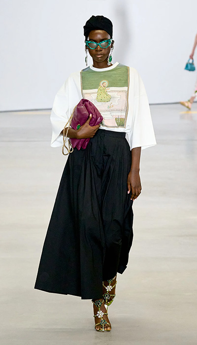 El diseñador encontró su paleta en un collage de mercados con flores, edificios y paisajes de Asia. Las pinturas de Botticelli fueron un gran elemento de inspiración, lo que llevó a plasmar en cada prenda su propio tono de alegría. Sus emociones se materializaron en un look que evocaba el glamour de la aristocracia romana de la época de los 60. La colección giró en torno a los sentimientos, colores y accesorios. “La idea es compartir mis emociones con mi cliente, no solo negocios”, dijo. “Quiero dar colores con olor, sabor y texturas, e inspirar sentimiento en el drapeado, la ligereza y la ondulación”, agregó Valli con una colección tan delicada como femenina y llevable.