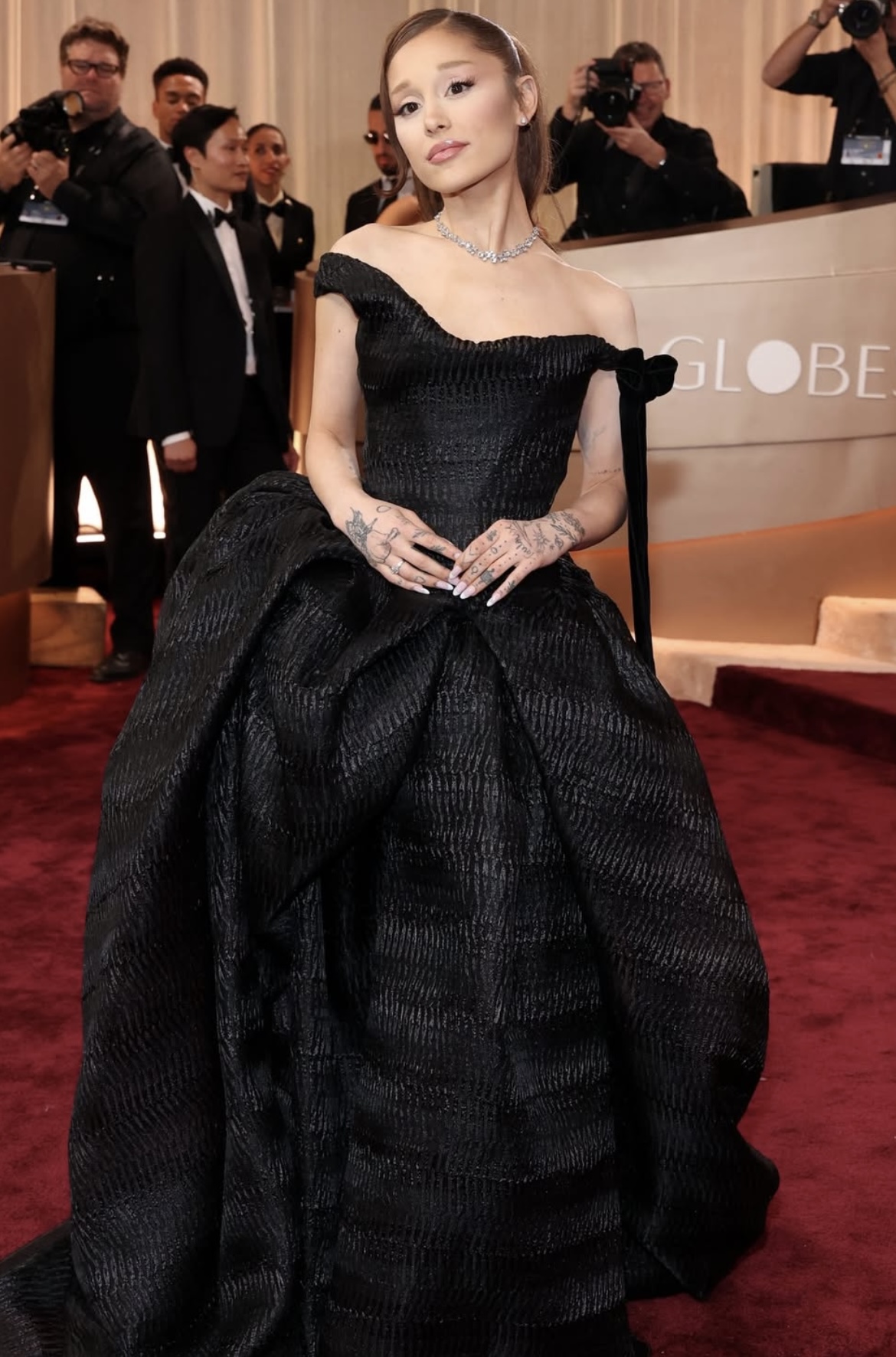 Otro de los looks más destacados, fue el de Jenna Ortega con un vestido de Dilara Findikoglu. En negro y con detalles como flecos y cortes laterales que jugaron con el diseño, lo acompañó con un moño relajado y tacones negros que reforzaron su estética gótica contemporánea. Miley Cyrus sorprendió con una vestido dramático de Saint Laurent en negro también, con volúmenes exagerados, hombros marcados y lentejuelas, combinado con anillos rockeros y unos lentes de sol. Ariana Grande, por su parte, optó por otro estilo con la alta costura de Vivienne Westwood. La elección fue un vestido negro off shoulder, decorado con detalles texturizados y falda aglobada, además de accesorios como un collar Swarovski, lazos y su clásico ponytail voluminoso.