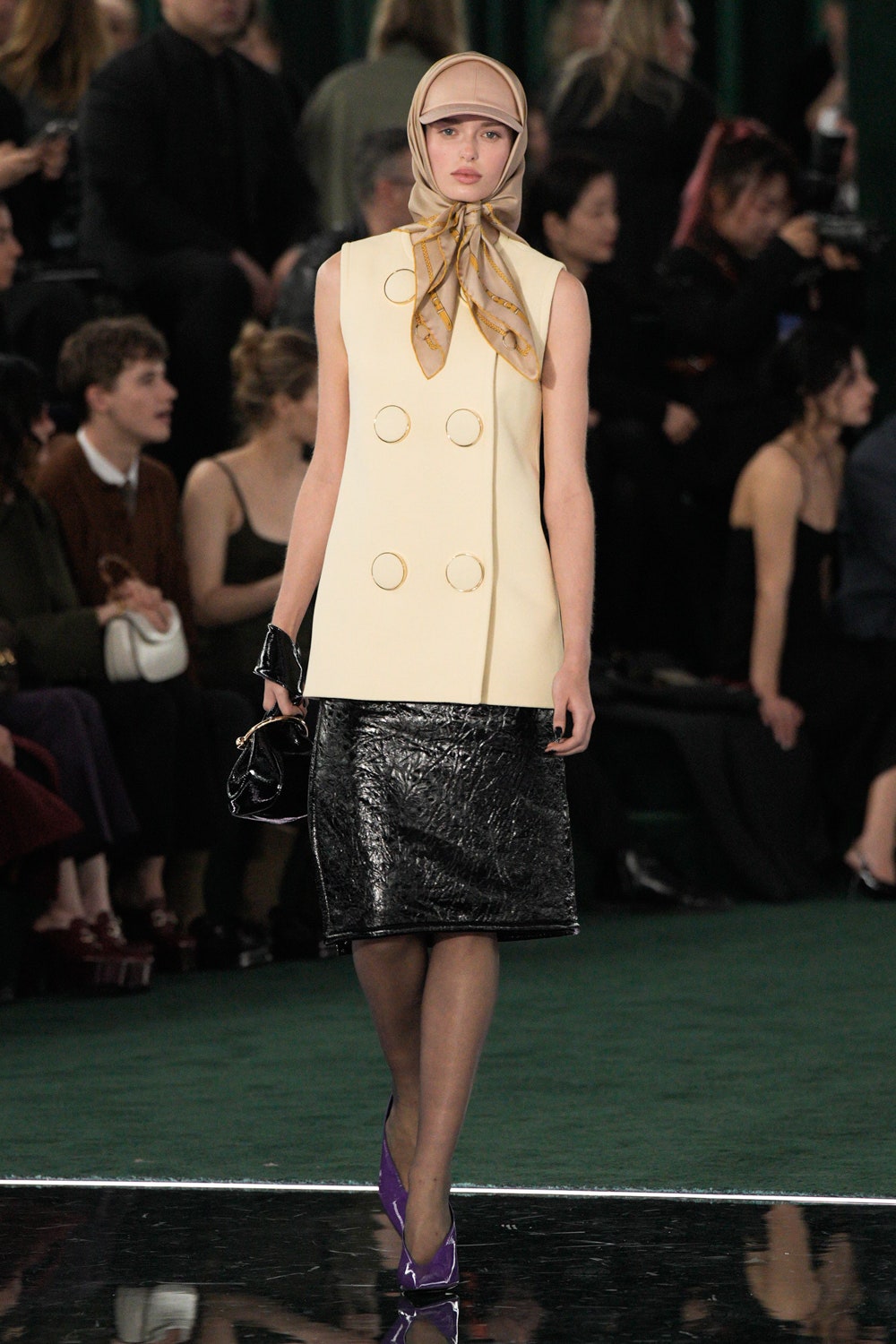 Un diálogo de dureza y suavidad continúa en las camisas de mohair cepillado, los cueros de nácar, las lanas revestidas y los bouclés unidos: abunda la experimentación con los tejidos, que abraza el clasicismo y la subversión. Las armonías de colores unen tanto la ropa de mujer como la de hombre en gradaciones de verdes, grises, malvas y marrones. Se adopta una síntesis de épocas en términos de silueta, desde finales de los años 60 (el inicio del prêt-à-porter de Gucci) hasta las décadas posteriores. Sin embargo, en la amalgama que va desde el minimalismo de mediados de los años 90 hasta el ultramaximismo más reciente, los motivos de Gucci se unen y la mezcla significa algo nuevo.