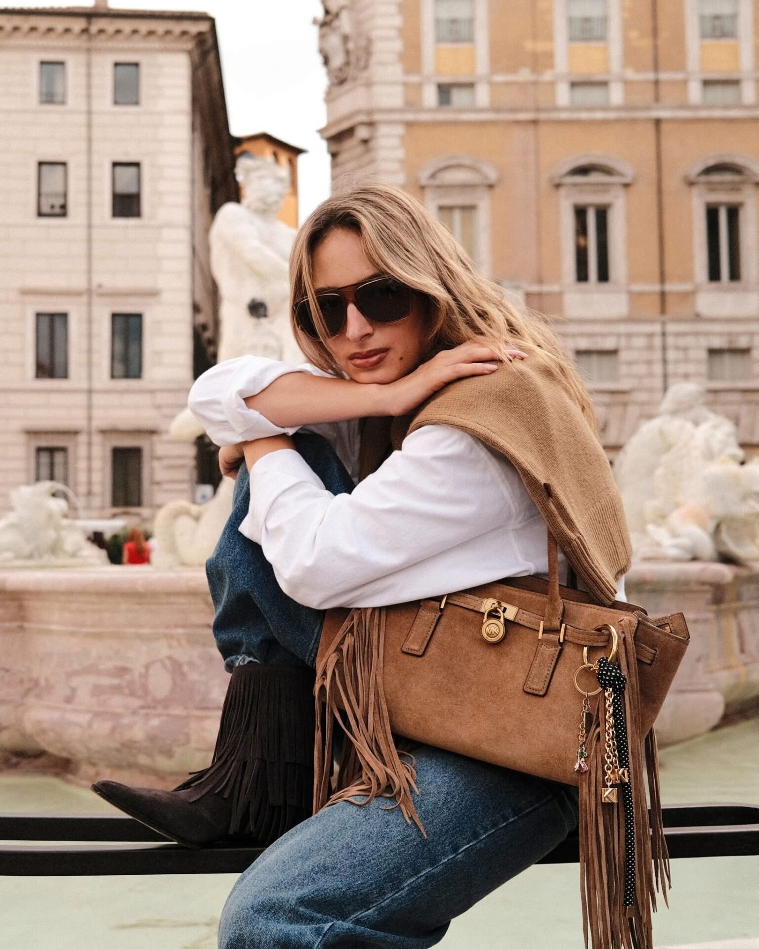 A veces encontrar el bolso perfecto parece misión imposible, porque buscas algo que sirva para todo, pero que al mismo tiempo no sea aburrido… Tu búsqueda podría terminar si es que consideras el Hamilton Moderne con flecos. Michael Kors sacó de sus archivos el icónico diseño Hamilton y le dio un giro total. Con un toque más contemporáneo y bohemio, se creó una pieza que se siente mucho más viajera y relajada, menos seria y con mucho más movimiento. Es ese accesorio que te pones con unos jeans y una camiseta blanca, y de repente, tienes un lookazo. Es perfecto porque evoca ese espíritu libre de los 70, pero sin caer en el “disfraz”. Y es que los detalles lo son todo. No es solo bonito, es práctico. Viene en gamuza (en colores clave como chocolate, beige o negro), con también flecos de gamuza y con correas más largas para colgarlo al hombro y olvidarte de que lo llevas contigo. Es el compañero ideal para esos días que empiezan con un café, siguen en la oficina y terminan en una comida improvisada con amigos. Idealmente para ocuparlo con tus outfits de otoño, pero es tan versátil que funcionará igual de bien en un festival de música como en una escapada de fin de semana. Es un clásico que se siente fresco y no vas a querer soltar.