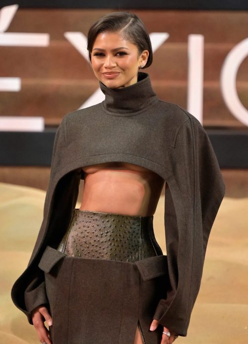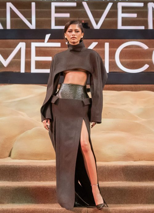 De pies a cabeza, Zendaya llevó un atuendo de color café oscuro. Aún así, el brillo del cuero y la opacidad de la lana creaban una diferencia visual. En esta oportunidad, Bottega Veneta rediseñó uno de sus looks presentados en la colección 2023 Ready-To-Wear. Con una apariencia más jovial y atrevida, el torso de Zendaya quedó al descubierto.