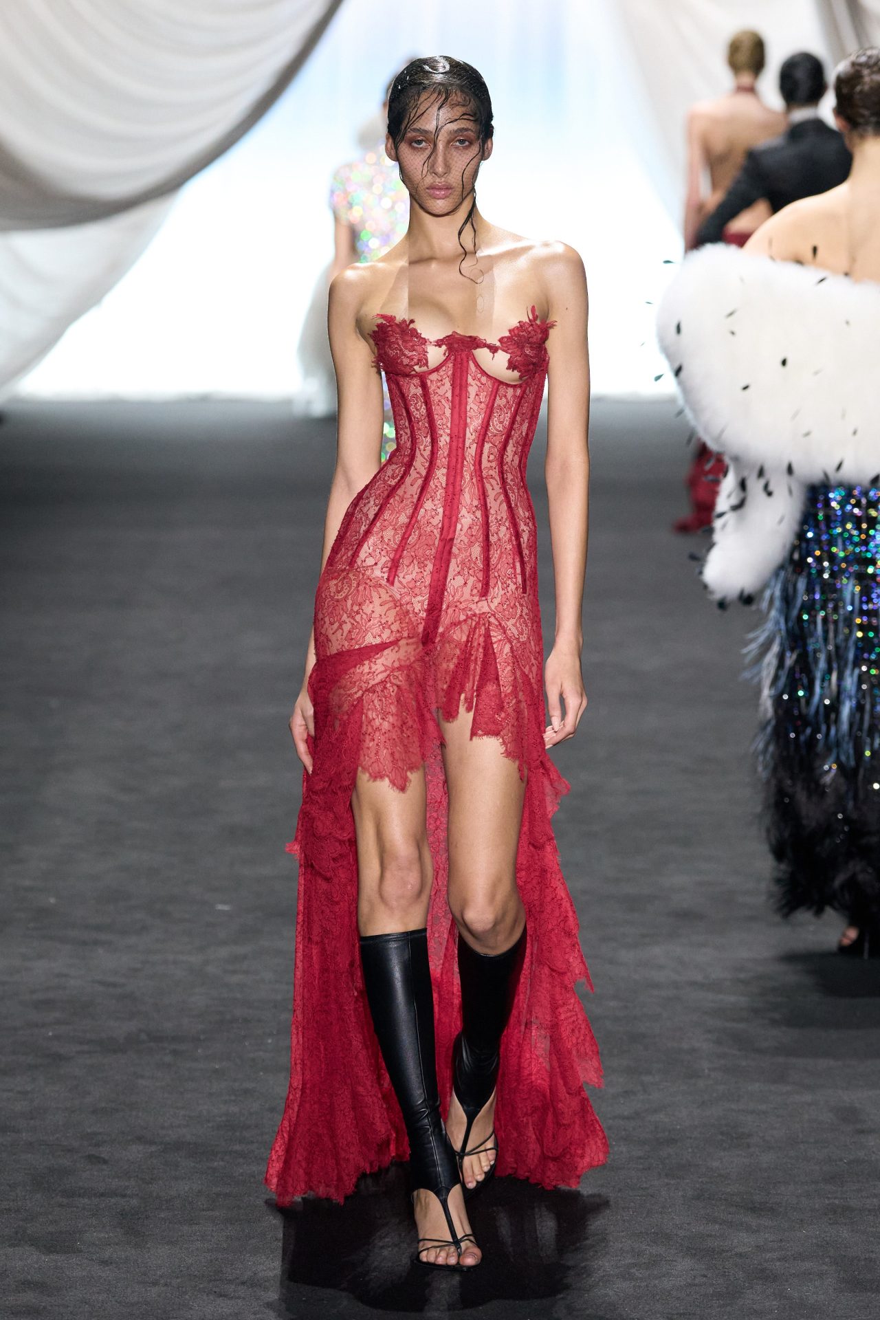 La colección fue un viaje sensorial que comenzó con una banda sonora de olas rompiendo, transportando al público a un mundo submarino lleno de misterio y seducción. El desfile abrió con una modelo que llevaba un corsé verde mar y una falda escamada que evocaba la cola de una sirena, una imagen que inmediatamente capturó la atención de todos. De Saint Sernin, conocido por su estética gótica sexy, jugó con elementos marinos de manera magistral: pelo mojado, adornos en forma de volantes de barco y vestidos que imitaban velas ondeantes o restos de un naufragio. Cada look contaba una historia, desde sirenas modernas hasta marineros perdidos en el amor, creando un universo donde la seducción y la aventura se entrelazaban de manera fascinante.