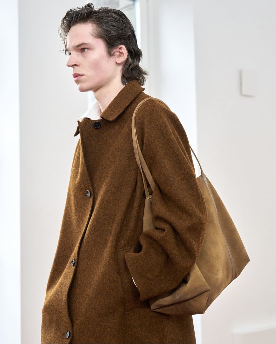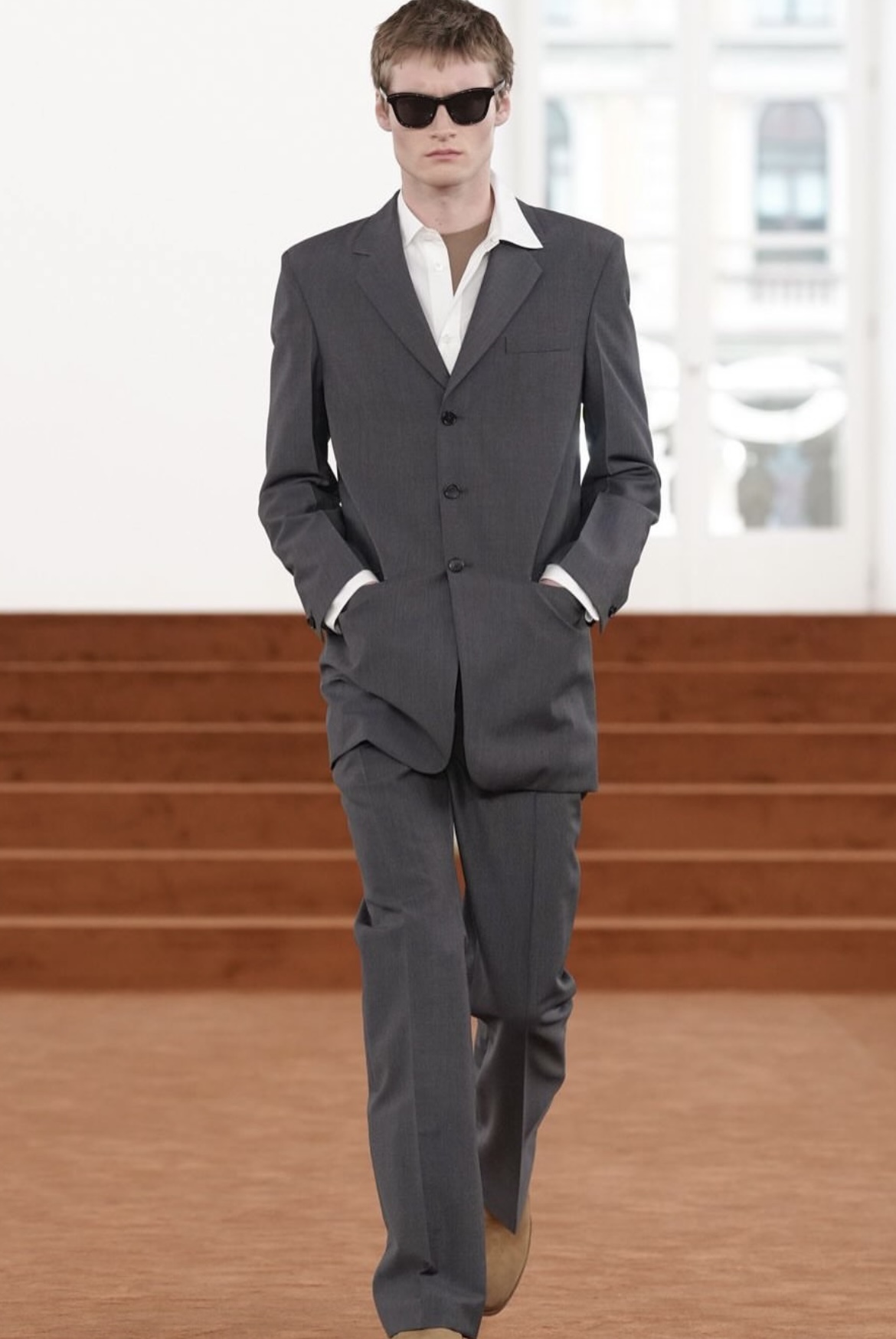 En la pasarela se observaron prendas tanto para mujer como para hombre, que reinterpretaron los códigos de la casa: abrigos y blazers de estructura precisa, pantalones con cortes curvilíneos y faldas rectas con aberturas marcadas a los lados. Los looks integraron detalles inesperados, como tajos en prendas clásicas, siluetas de prendas aglobadas y cortes que se sienten casi arquitectónicos, conectando con la narrativa de hogar como metáfora de transformación. La paleta neutra como protagonista, se abrió con toques de azul y estampados sutiles, mientras que accesorios como tacones y calzado unisex tipo ballerina, reforzaron ese contraste elegante entre funcionalidad y expresión.