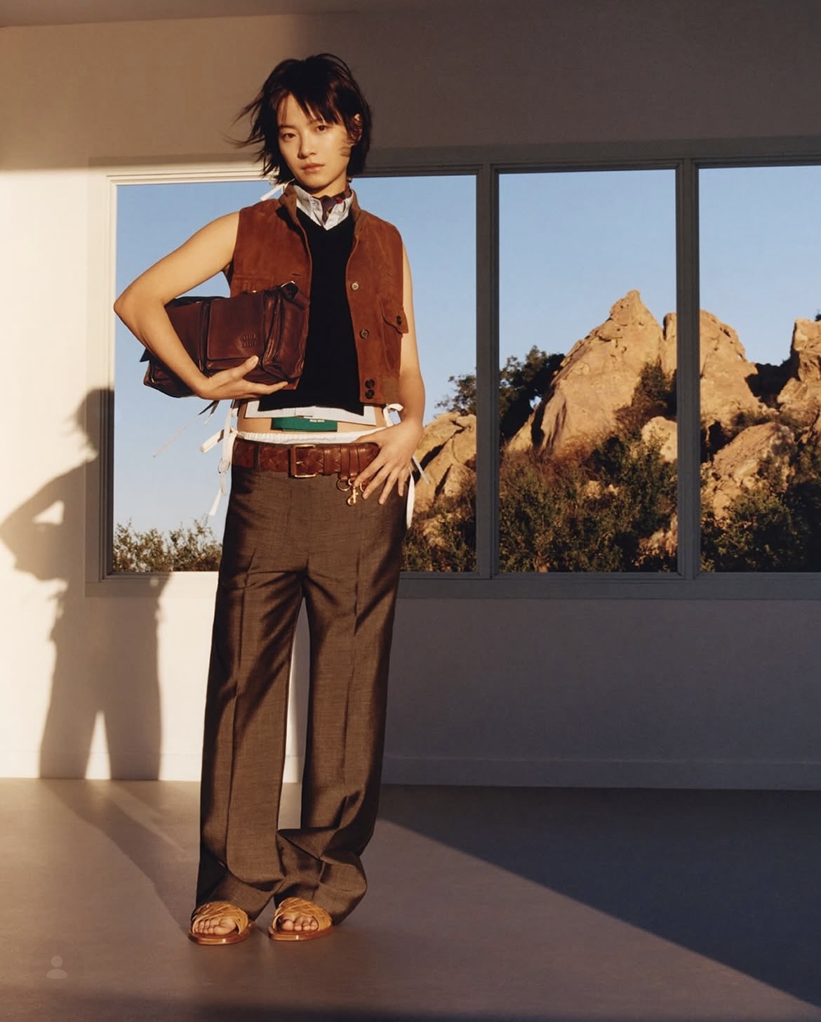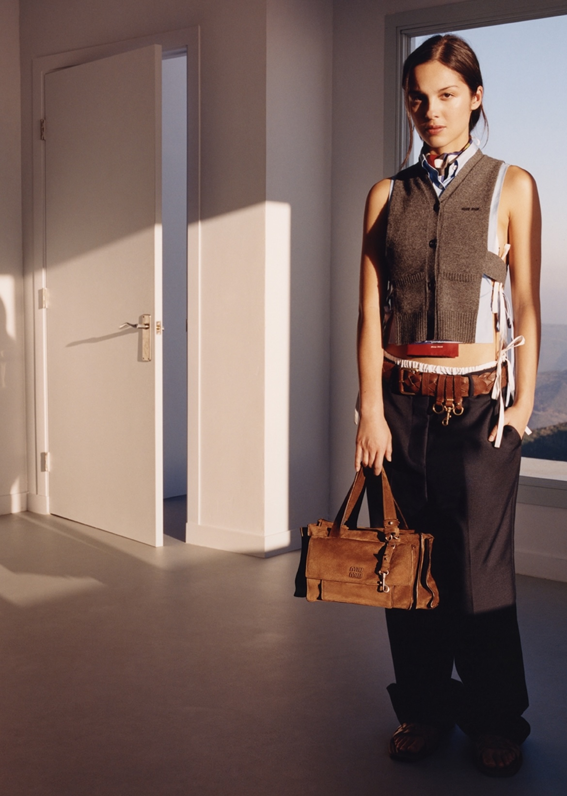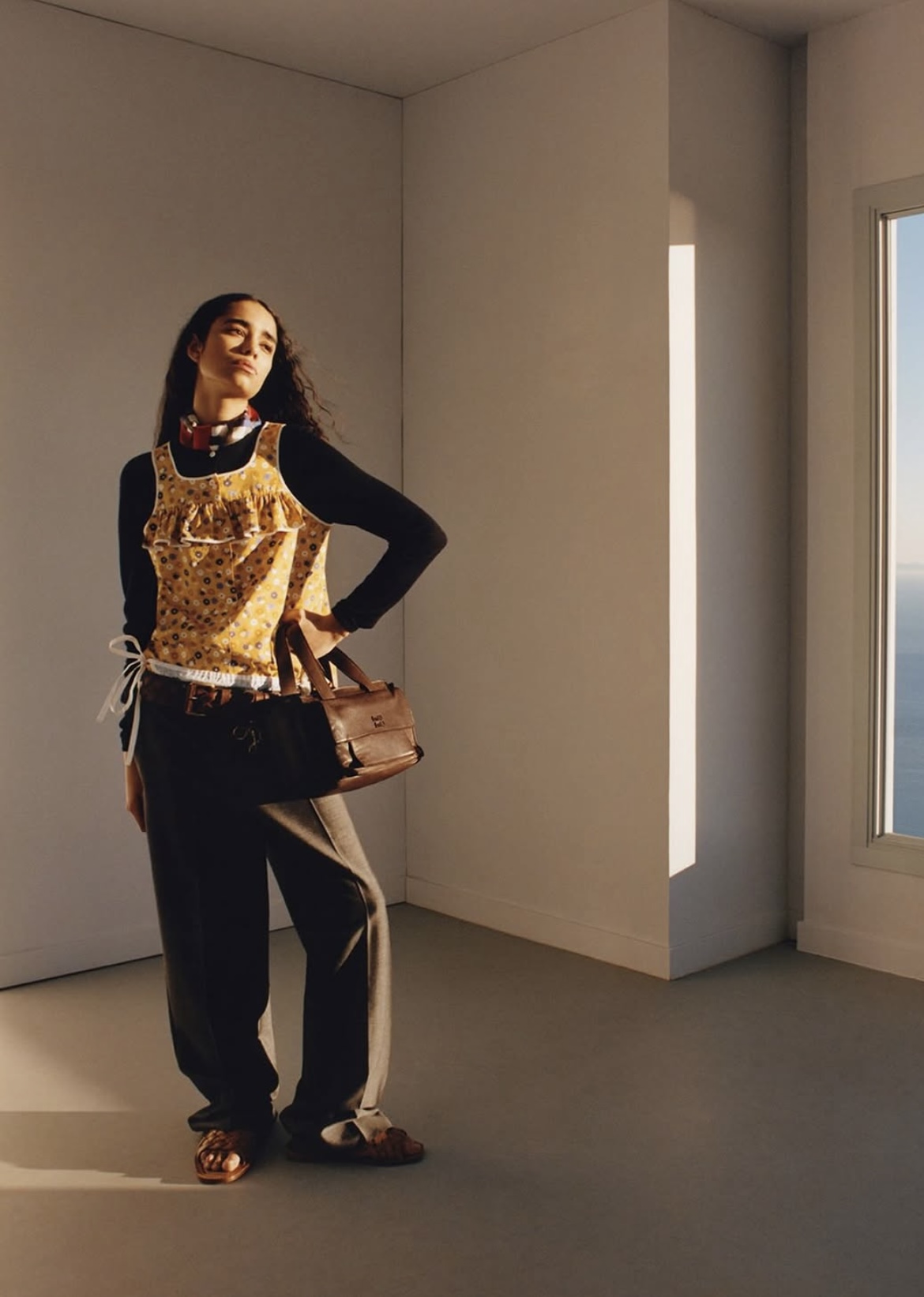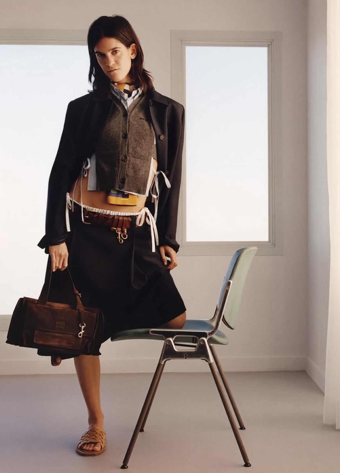 La colección propone la idea a través de una combinación de contrastes. Siluetas estructuradas, cueros y tejidos firmes se fusionan con detalles delicados como flores, bordados y transparencias sutiles. La paleta se mueve entre tonos neutros y matices suaves, acompañando el carácter sereno del espacio. Miu Miu vuelve a trabajar una feminidad que habita lo cotidiano con naturalidad. Las prendas se sienten diseñadas para el movimiento y la vida real, alejándose de una propuesta excesivamente conceptual.