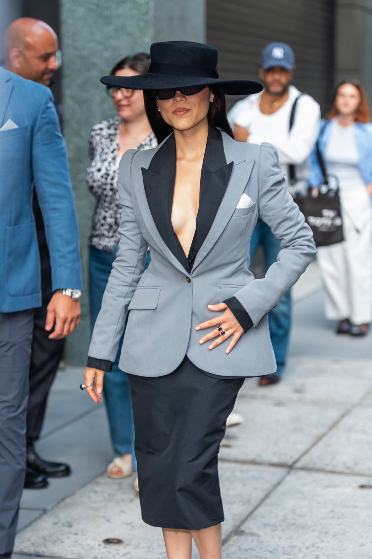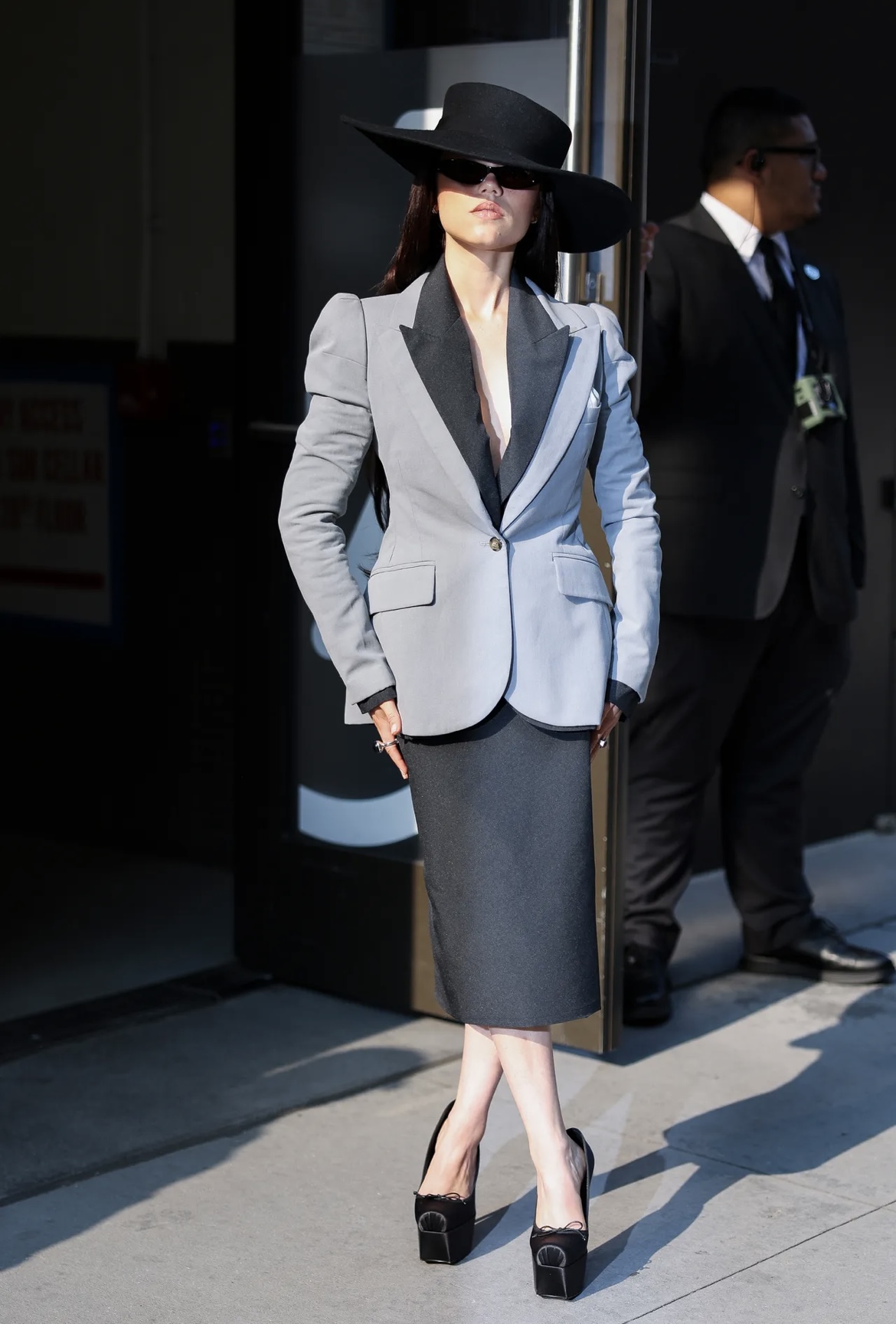 El estilo de Ortega quedó aún más claro en su aparición en Good Morning America, donde optó por un look formal de Morticia: blazer estructurado, falda lápiz y sombrero, todo en gris y negro, a lo que le sumó unos lentes de sol ovalados y tacones con plataforma. Y para romper esquemas, sorprendió con un vestido de Elena Vélez y unas sandalias mitad flats de malla, mitad stilettos, que rompieron las reglas tradicionales del calzado. Así, cada aparición del “Doom Tour” confirma que Jenna Ortega no solo protagoniza una serie, sino también una de las giras de moda más memorables del año.