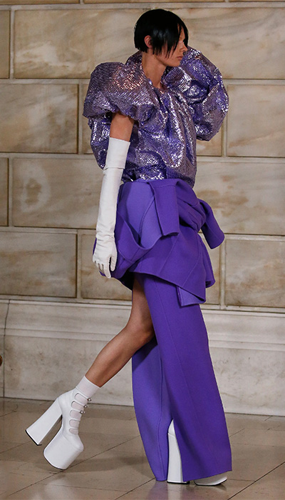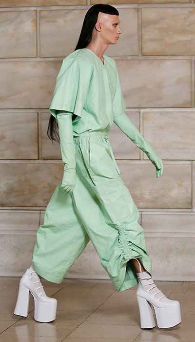 “La creatividad es esencial para vivir”, mencionó Jacobs en una declaración. Y es que precisamente esa premisa, junto con el arte como refugio, fue la base de la campaña. Con modelos casi irreconocibles y looks totalmente futuristas, piezas de grandes volúmenes en tonos oscuros, materiales que iban desde papel de aluminio, yeso, vidrio, caucho, entre otros, el diseñador optó por siluetas distópicas combinadas con algunos elementos básicos de la ropa deportiva de Estados Unidos. ¿Las prendas estrellas? Los cárdigan y suéteres de tela gruesa que estaban entrelazados uno encima del otro. También destacaron los vestidos, bolsos y plataformas XXL, mini top con brillos combinados con faldas y guantes que parecen de látex.
