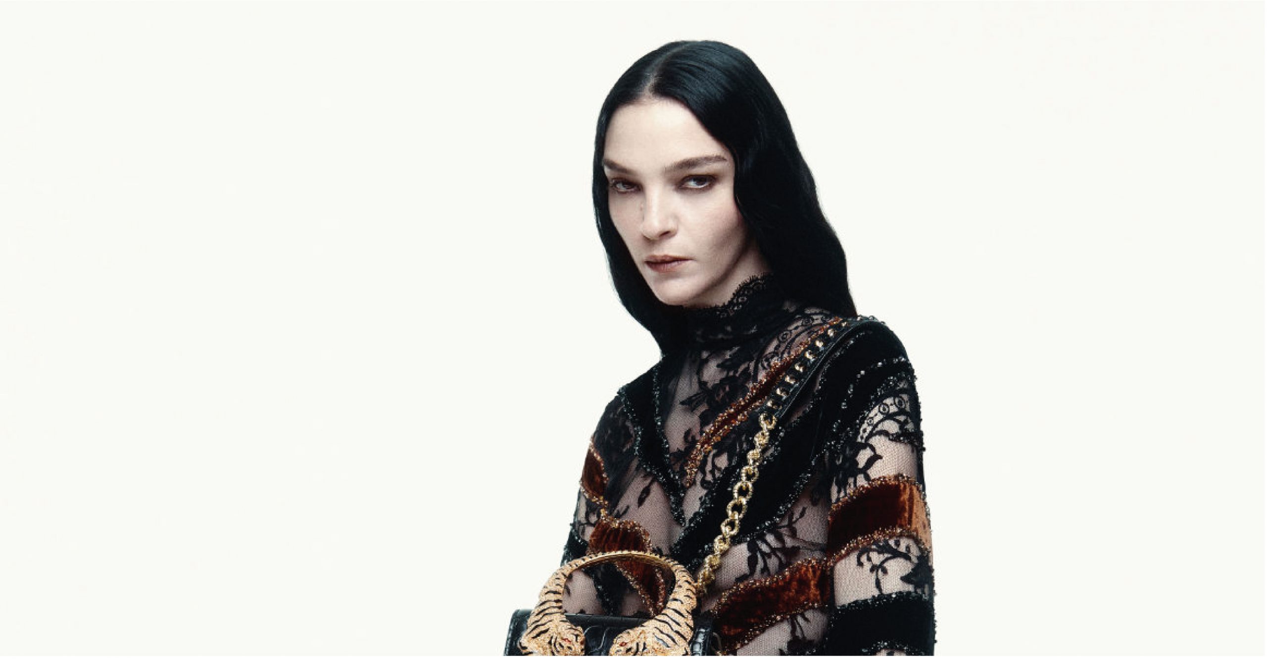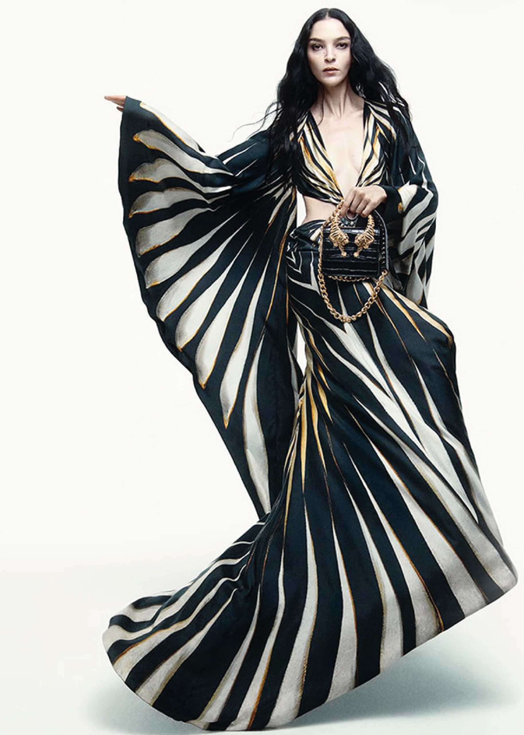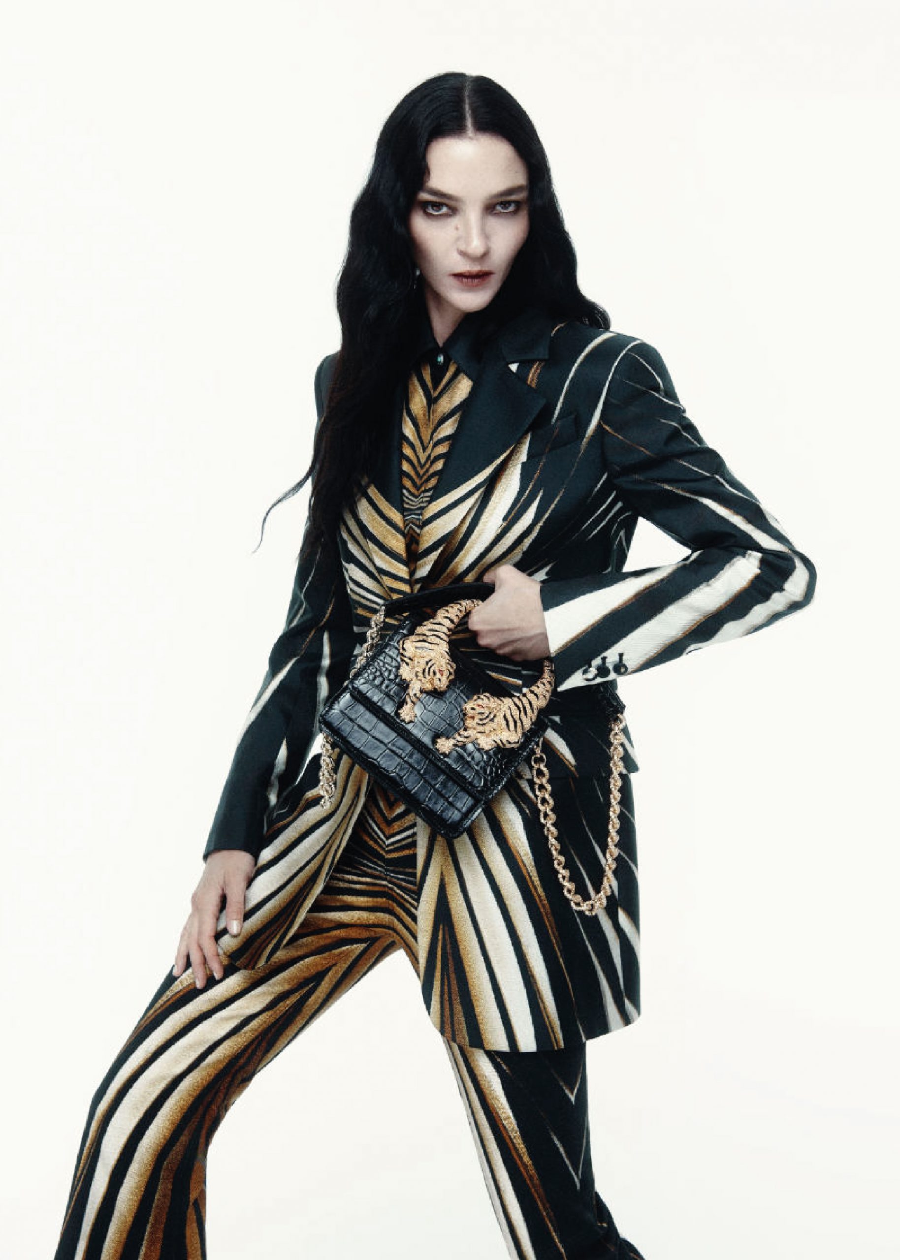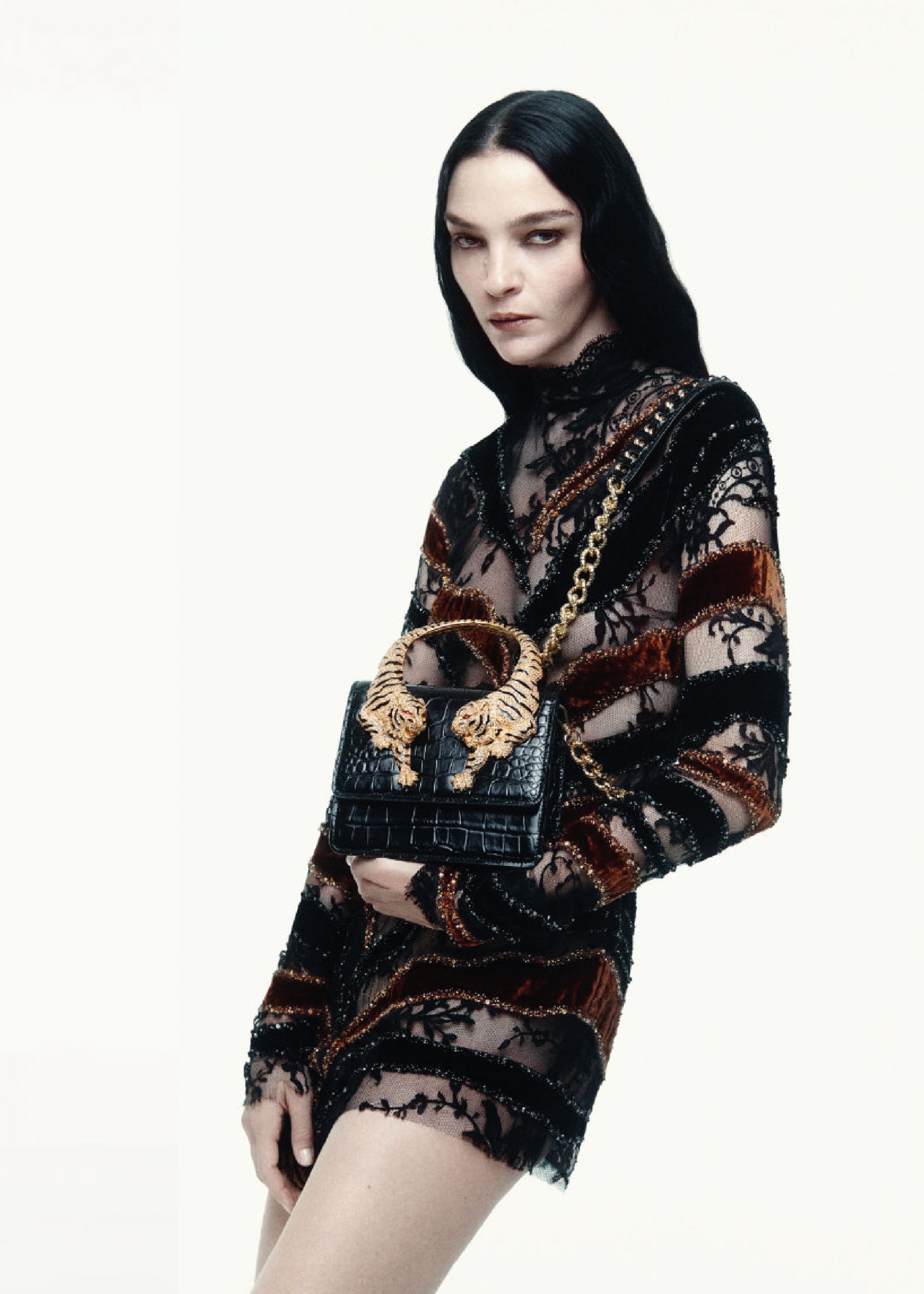 Mariacarla Boscono irradia un brillo cautivador en las fotografías, su tez resaltando de manera armoniosa en conjunto con los colores de las prendas y accesorios. El bolso “Roar” exhibe una silueta cuadrada en color negro, acentuada por dos asas con forma de tigres dorados que añaden un toque de elegancia distintiva. Además, se completa con una cadena dorada con brillantes, que aporta sofisticación adicional. La colección Otoño/Invierno 2024 de Roberto Cavalli se caracteriza por sus seductores patrones, estampados en telas con texturas de encaje y terciopelos afelpados. Los vestidos presentados en la campaña, no solo son un accesorio que acompaña al bolso, sino que también simbolizan la evolución de la estética del diseñador. La imagen de la mujer moderna se equilibra magistralmente entre la inocencia y provocación, abrazando su feminidad con una mezcla de glamour y orgullo sin restricciones.