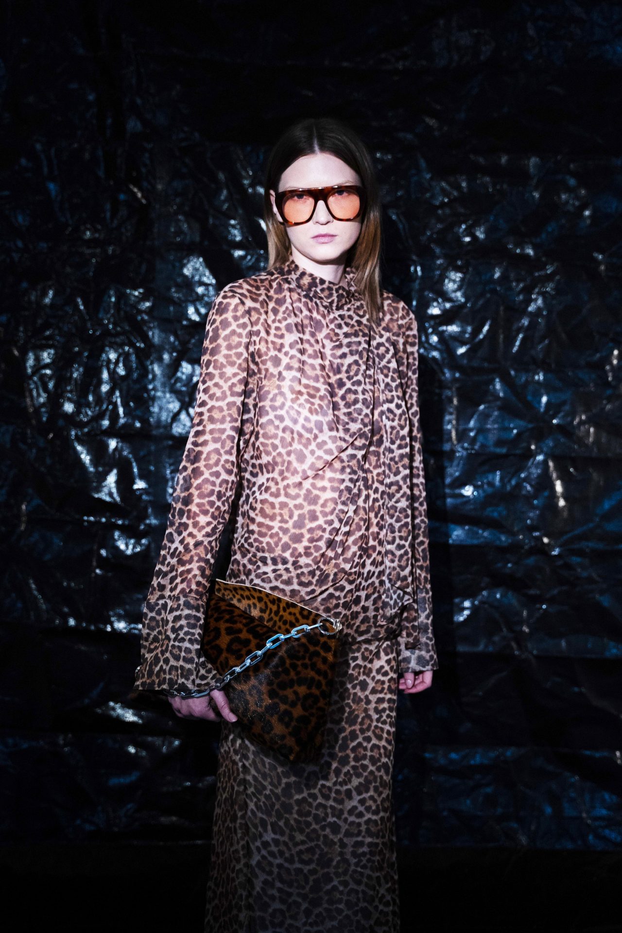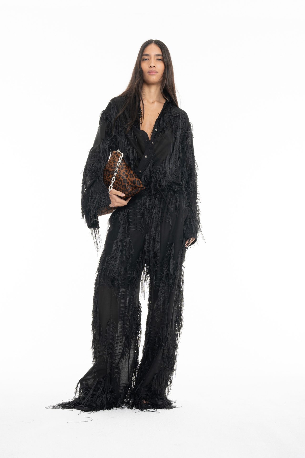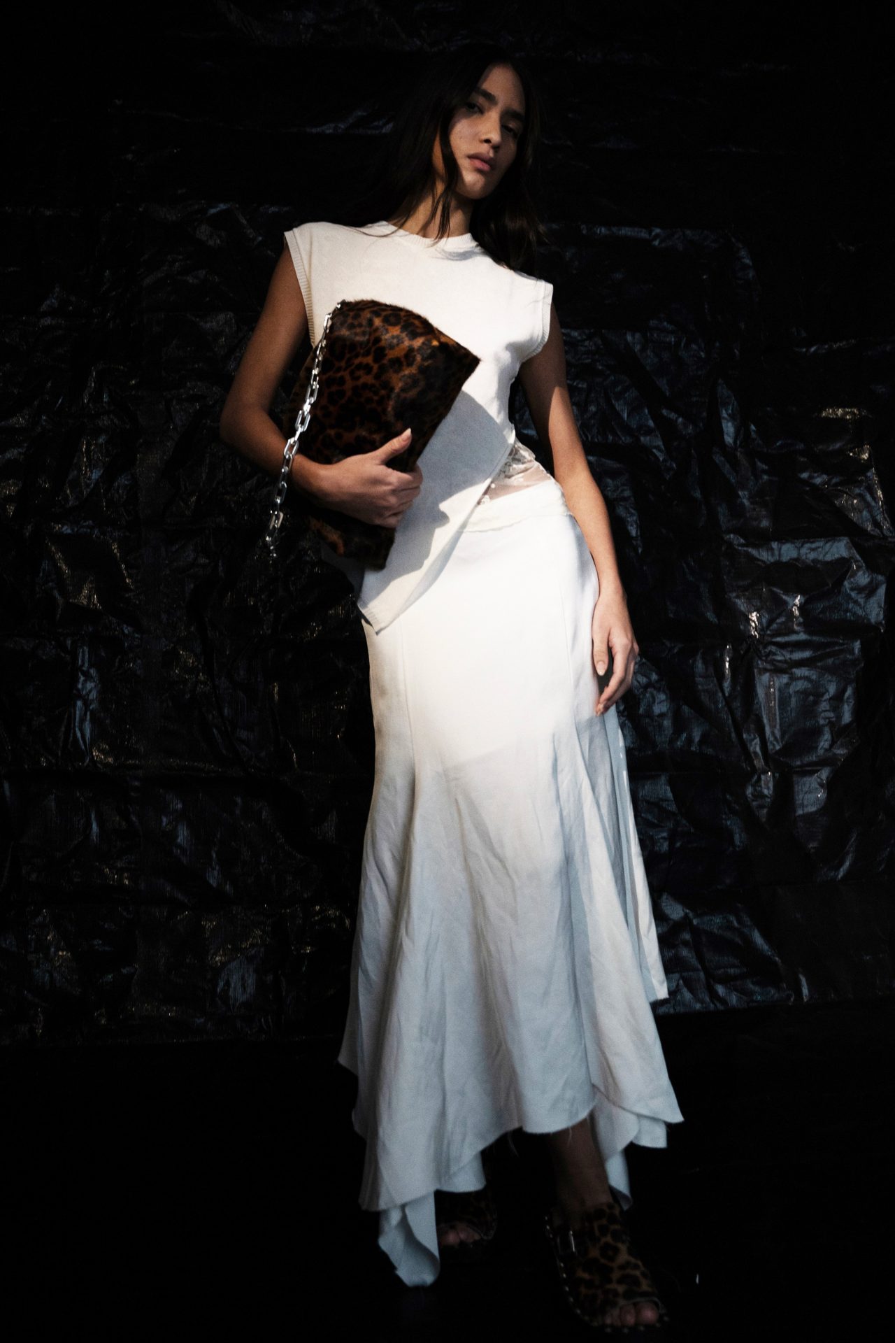 Uno de los grandes protagonistas es el animal print, aplicado con decisión sobre siluetas esbeltas que parecen diseñadas para caminar sobre alfombras rojas o pistas de baile clandestinas. El uso de tafetán con volúmenes exagerados —en especial en los vestidos con espalda abullonada— recuerda sutilmente a la alta costura de los años 50, aunque filtrada por una óptica contemporánea y sin reglas. Esta es, como lo define el propio Paulo Almeida, ropa para “eventos”, sí, pero nunca convencional: hay algo teatral, una vibra de anti-fiesta, como si cada prenda invitara a romper las normas del vestuario elegante desde dentro.