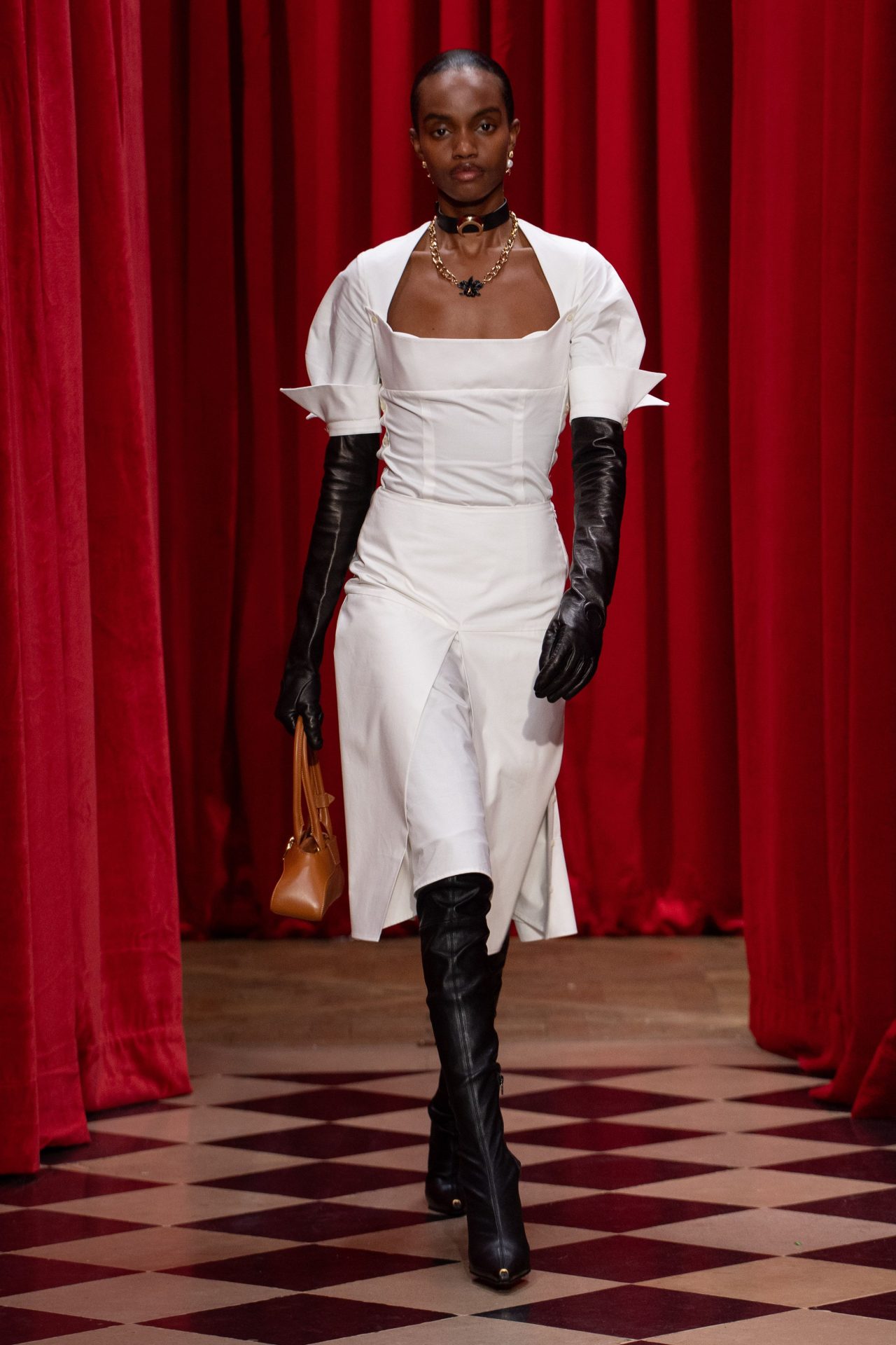 La pasarela abrió con looks de cuero estructurado, donde chaquetas entalladas y pantalones de silueta ceñida marcaban una línea de autoridad sin perder la fluidez del movimiento. La referencia a la sastrería masculina era evidente, pero Serre la desmontó con detalles inesperados: cinturones formados por mangas de camisas recicladas, abrigos de piel reconstruidos con materiales de otras épocas y vestidos de noche ensamblados a partir de camisones vintage. Más allá de la composición de las prendas, la diseñadora planteó una estética que desafía la percepción clásica de la sensualidad. La piel se revela estratégicamente, sin caer en la obviedad: aperturas en la cintura, transparencias sutiles y tejidos que moldean el cuerpo con naturalidad. Aquí, la seducción no radica en la exposición, sino en la actitud con la que se lleva la ropa.