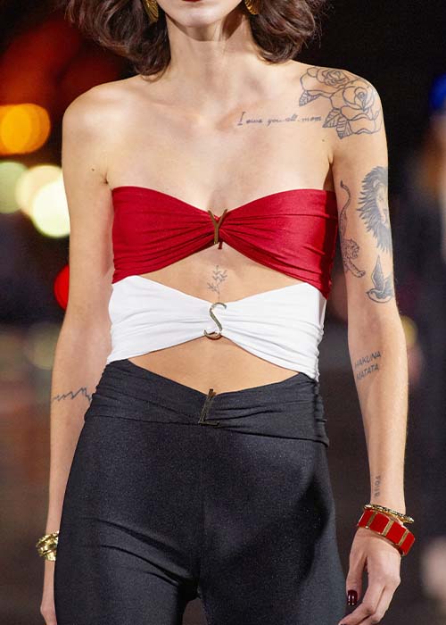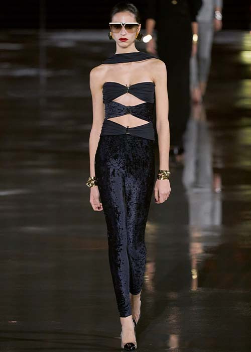 Satinado o aterciopelado. En rojo, blanco y negro, o en un negro destellante, decorado con las iniciales de la maison: YSL. Un detalle dorado que acompaña esos atrevidos cut outs, donde la sensualidad y la elegancia son una. You must have: Kendall Jenner in Yves Saint Laurent Spring/Summer 2022.