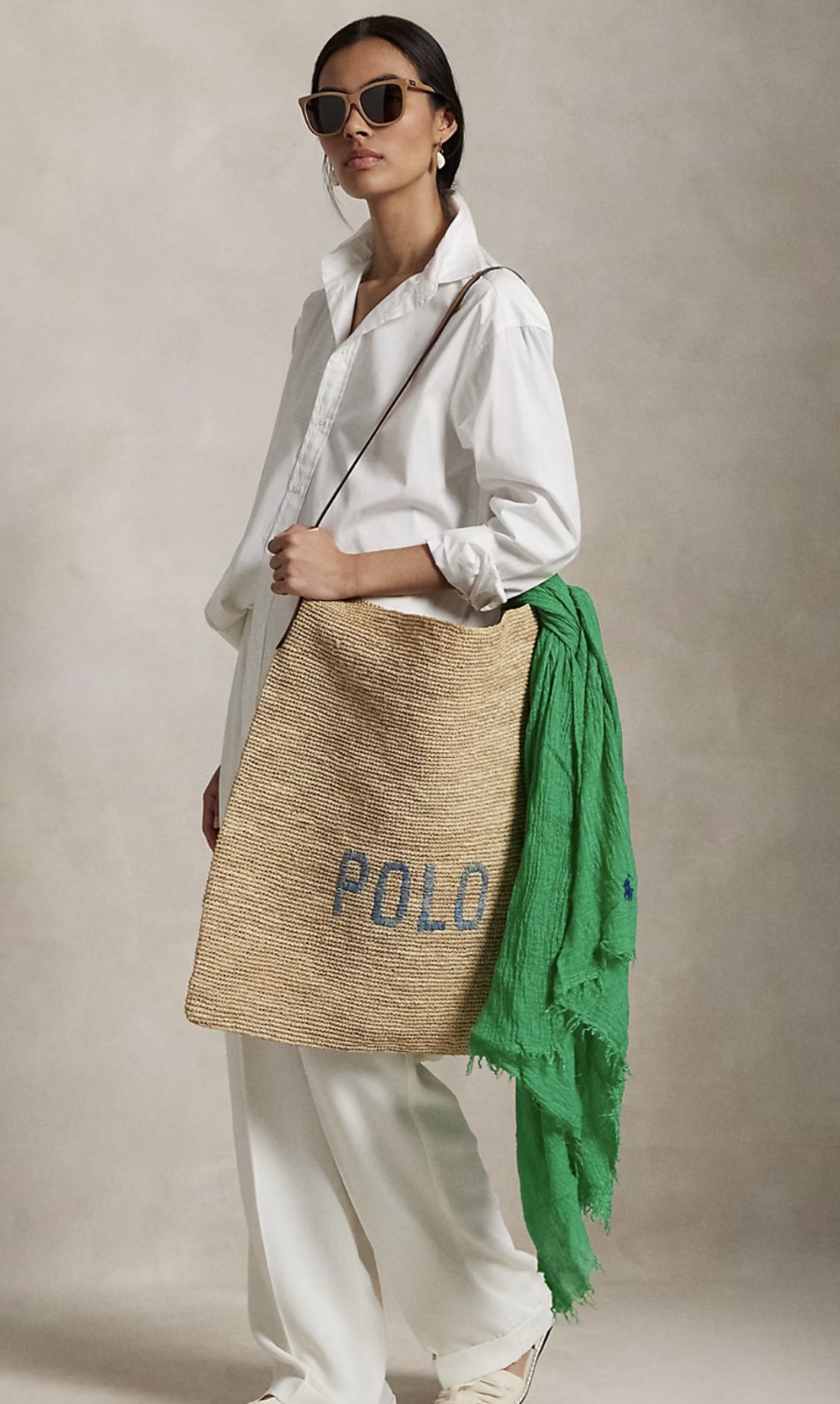 El Extra‑Large Tote de Polo Ralph Lauren es el accesorio veraniego por excelencia. Confeccionado en rafia natural y asas de cuero italiano, ofrece un interior único y muy espacioso, perfecto para llevar bloqueador, toalla, bikini y ropa de cambio al ritmo de un día entero en la playa. El logo “Polo” bordado aporta distinción; es grande pero mantiene sutil un equilibrio visual sin perder elegancia. Su textura tejida y su estética fresca lo convierten en el compañero ideal para escapadas bajo el sol.