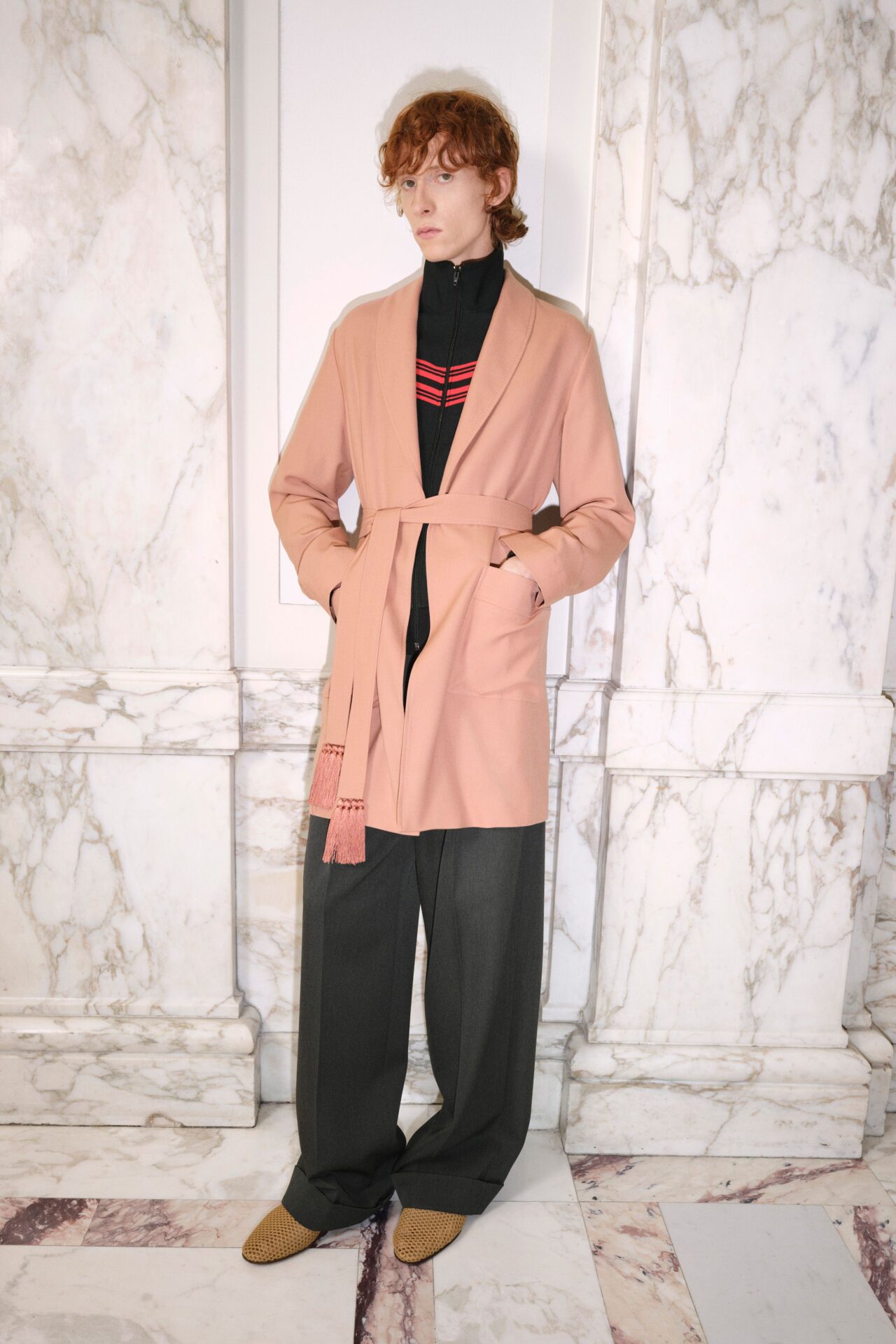 Los accesorios toman un rol clave dentro de la colección. Michele los usa como un espacio para concentrar identidad sin sobrecargar el resto del look. El Rockstud vuelve con ciertos cambios, más preciso y afilado, con guiños a Roma y a la historia de la casa. Los bolsos, especialmente el DeVain, aparecen en múltiples versiones, colores y tamaños. En el vestuario masculino sucede algo parecido: trajes más suaves, cortes relajados, colores sobrios y pequeños gestos inesperados que rompen la rigidez.