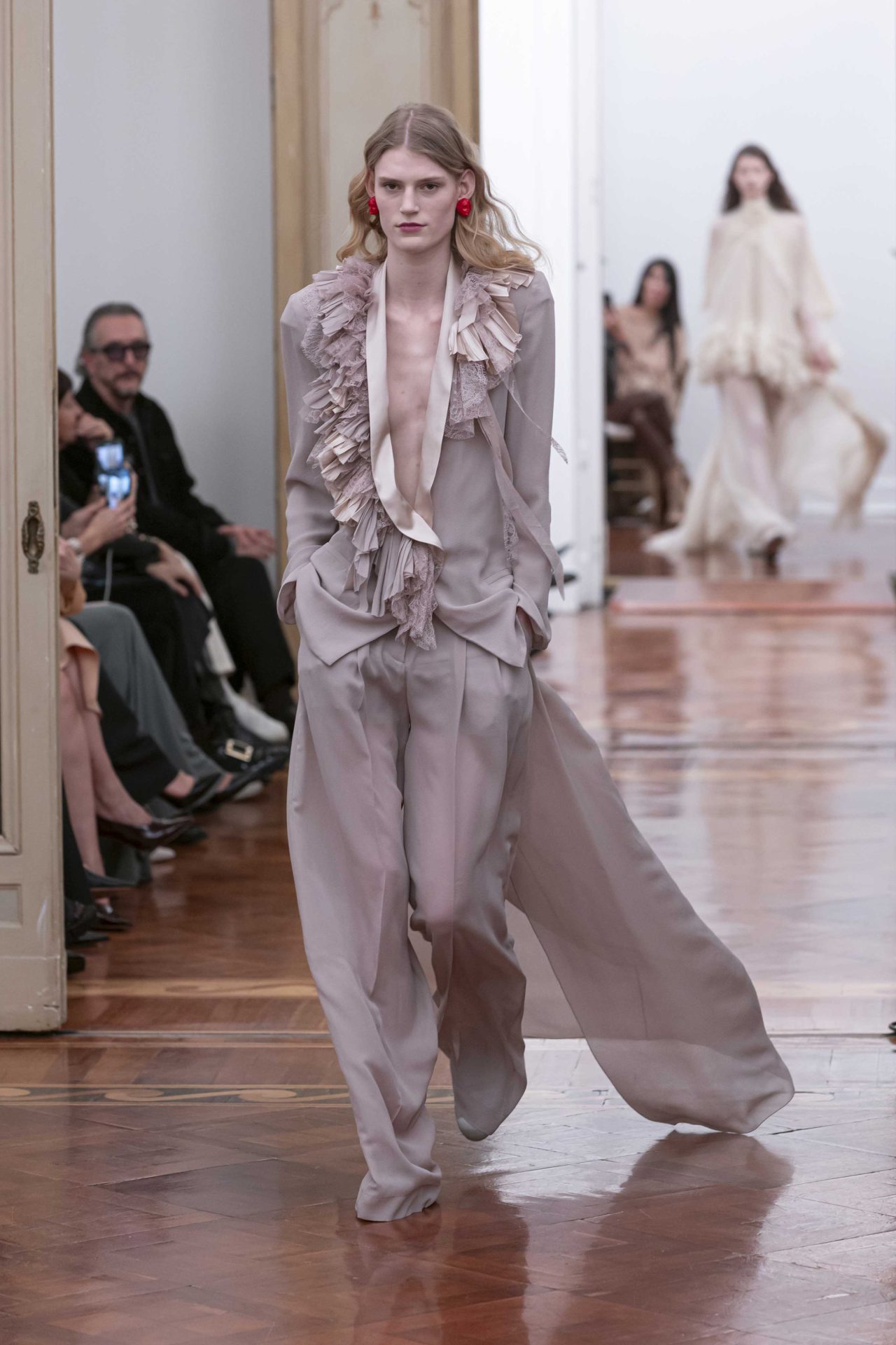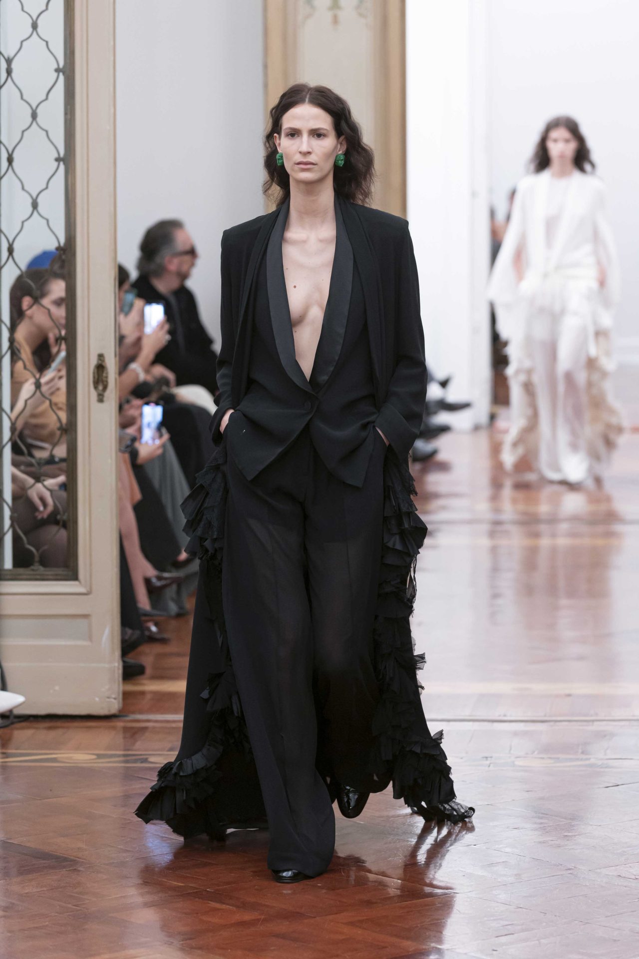 La paleta de colores osciló entre tonos neutros como el crudo, el marrón chocolate y el negro, interrumpidos por destellos de rosa suave, azul cobalto y rojo cereza. Las siluetas fueron variadas: desde trajes sastre desestructurados hasta faldas globo de gasa y blazers con solapas casi imperceptibles. Cada prenda transmitía comodidad y sensualidad, demostrando que lo romántico puede ser tan práctico como poético. Los accesorios, como zapatillas inspiradas en las de casa y bolsos funcionales, añadieron un toque de cotidianidad a la colección, recordándonos que la elegancia no tiene por qué ser incómoda.