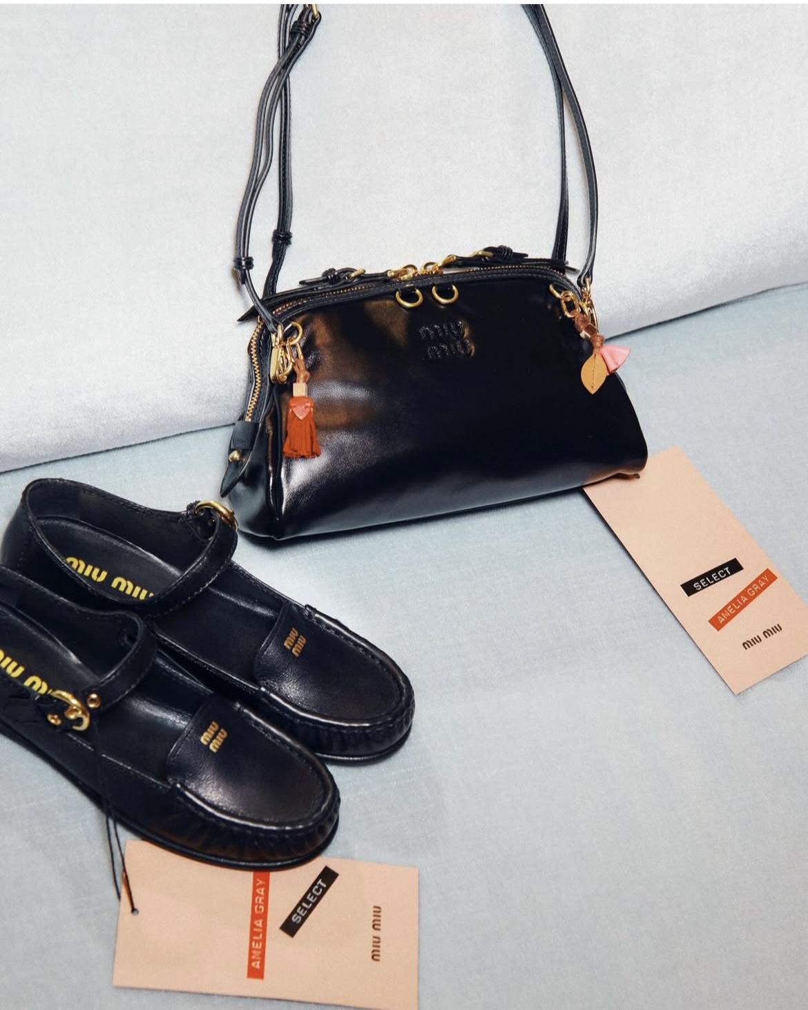 La curaduría de Amelia fue presentada en un espacio completamente transformado para la ocasión. La tienda tomó elementos de un salón literario, un cine independiente y un club privado de Mayfair, creando un ambiente íntimo y acogedor. Las telas de seda, los tonos suaves y la puesta en escena reforzaron la idea de que Miu Miu no solo muestra productos, sino que construye momentos reales. Cada pieza seleccionada por Amelia incluía una etiqueta con su firma escrita a mano y se entregaba en un packaging exclusivo desarrollado especialmente para Select. Este gesto simple, pero preciso, convertía cada prenda en algo más personal, casi como si llevara un toque directo de la modelo.