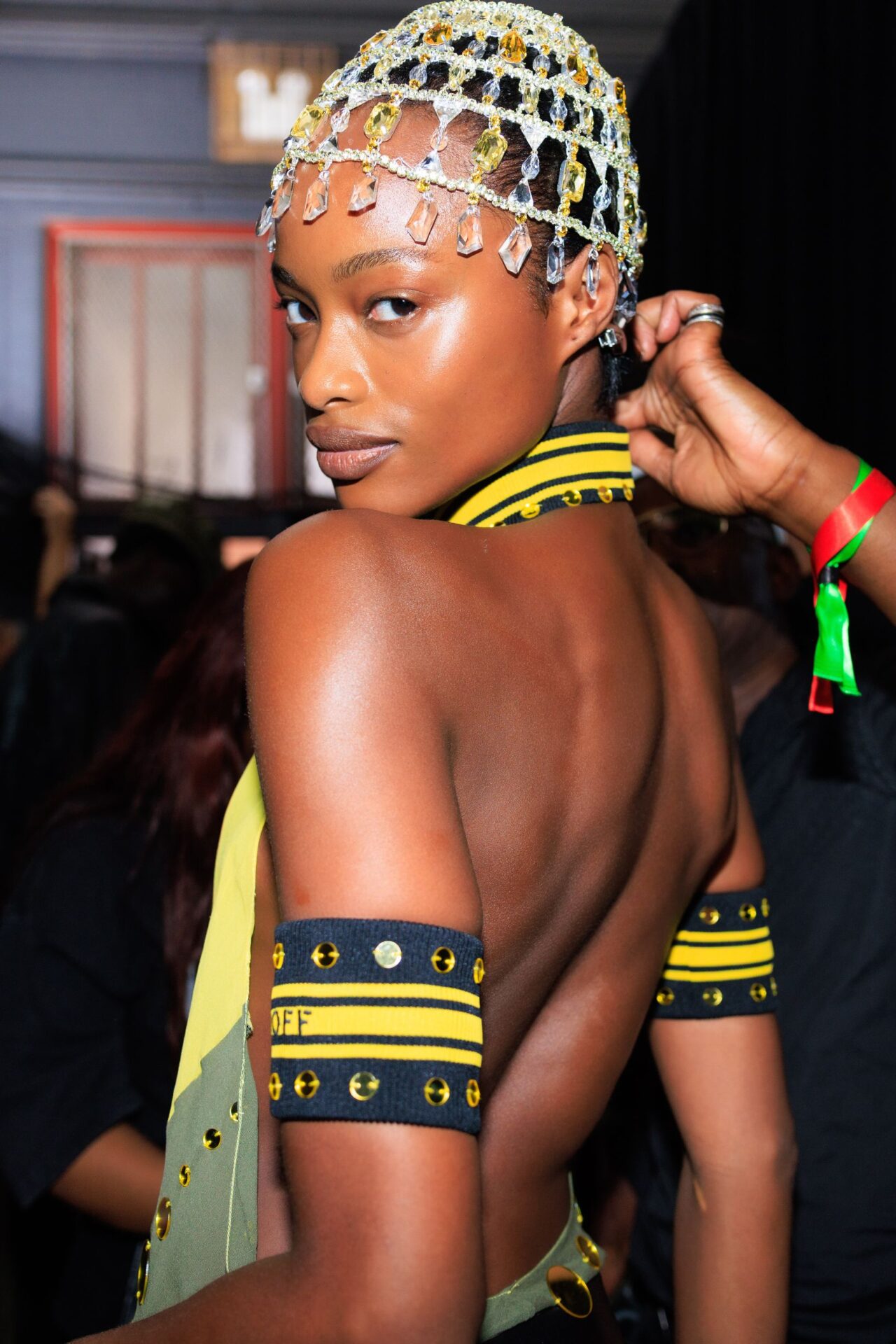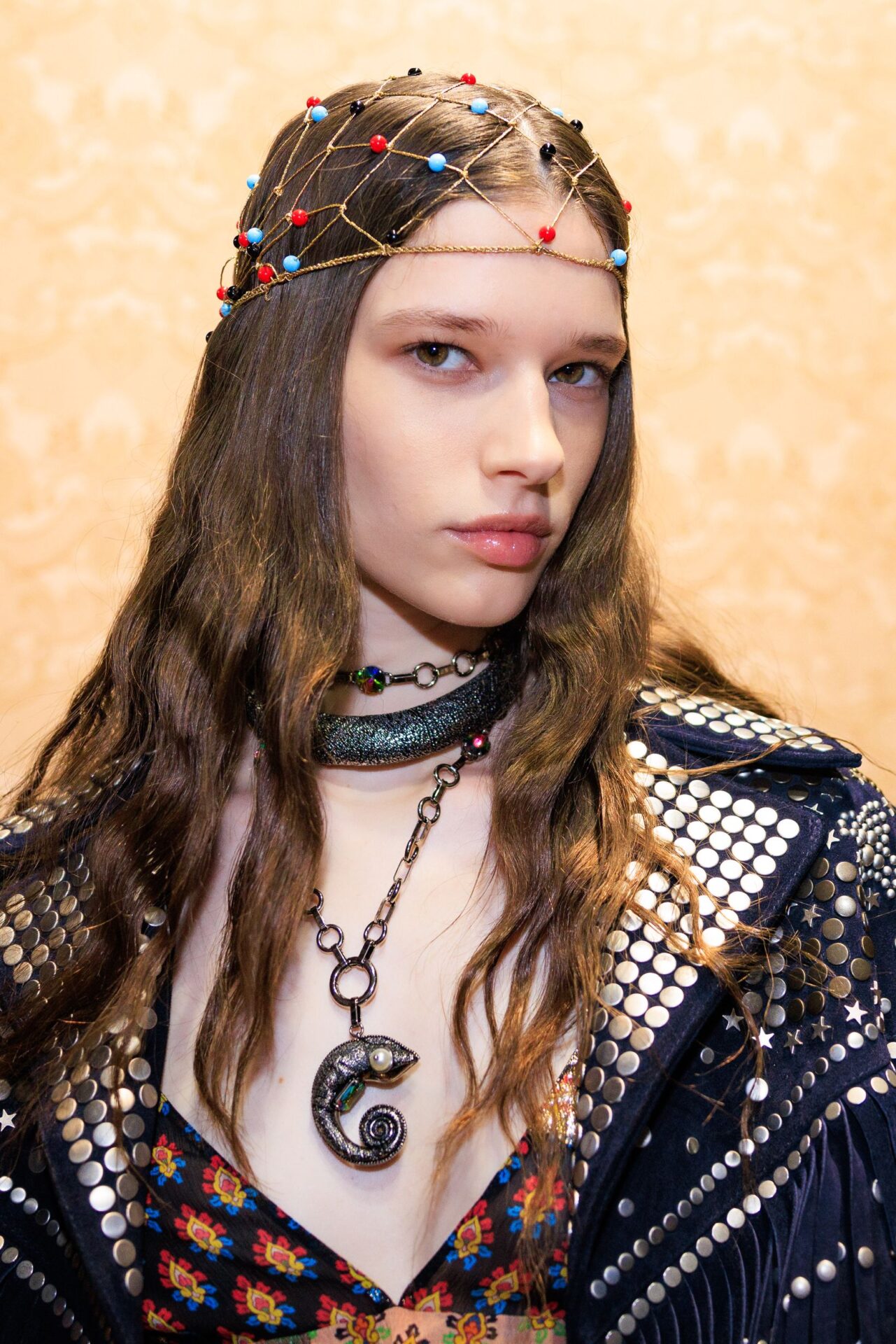 En materia de joyas, la temporada lo deja claro: ¡más es más! La idea es jugar y mezclar sin miedo, como vimos en Versace y Balmain, donde los collares y pulseras se llevaban de a montones. También vuelven las cuentas, con ese aire libre y artesanal que recuerda al verano, perfectas para darle un toque de color a cualquier outfit, como propuso Tory Burch. Si te gusta el drama, te vas a enamorar de las piedras gigantes y los cristales de Schiaparelli. Y para un cierre espectacular, están las joyas que parecen fuegos artificiales, como los aros de mariposas de Valentino. ¿Y por qué no llevar joyas en el pelo? En Off-White y Etro se atrevieron.